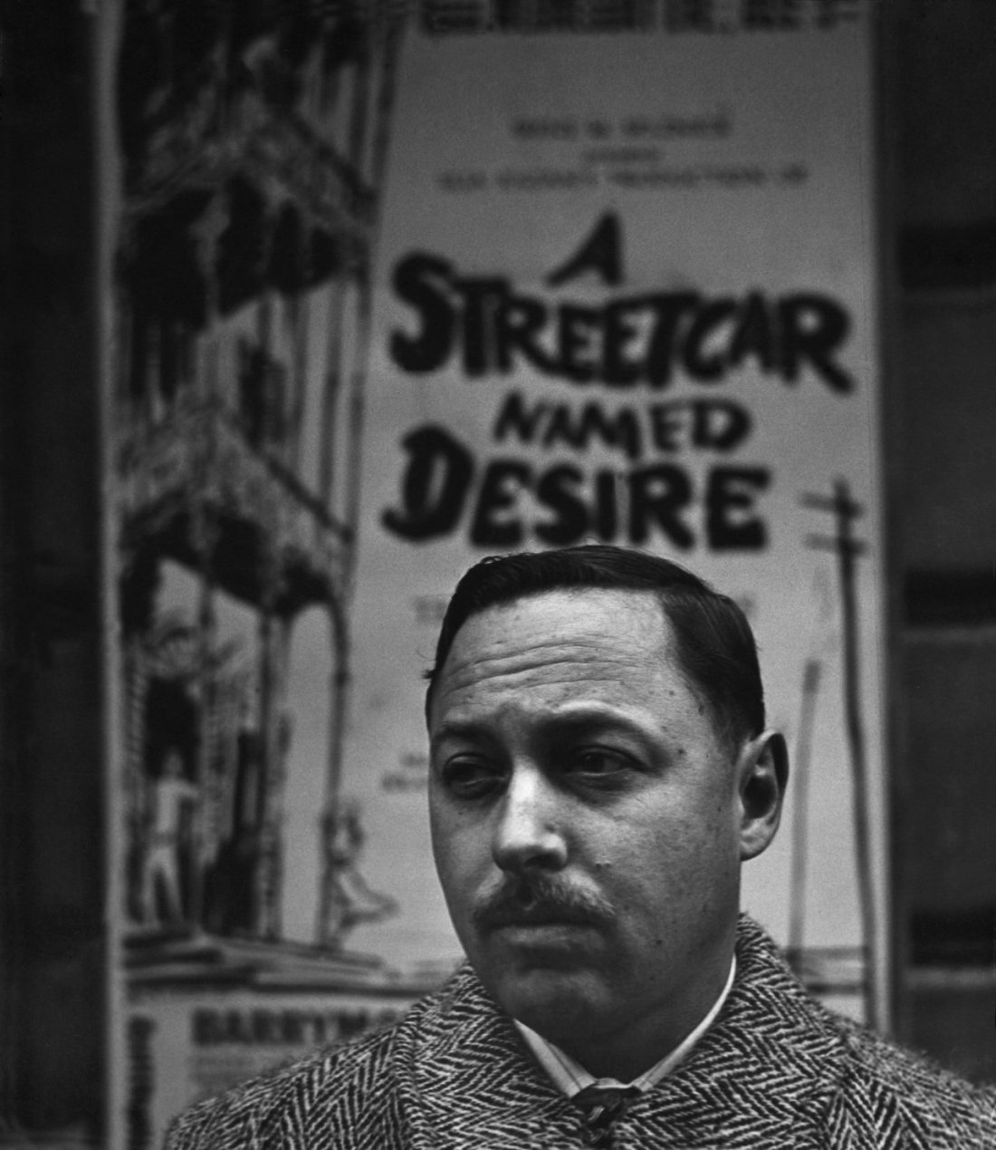 :: Tennessee Williams stands in front of a poster advertising his play, A Streetcar Named Desire, in New York, 1948. The LIFE Picture Collection/Getty Images