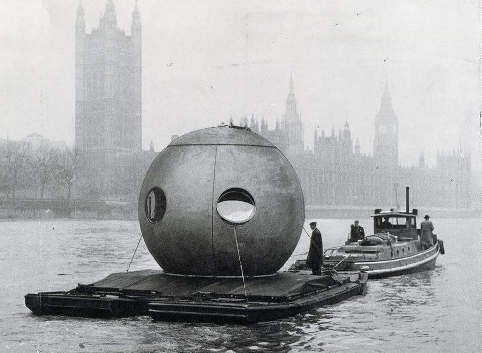 Juni Ludowici’s Round House being transported down the River Thames, 1958. /