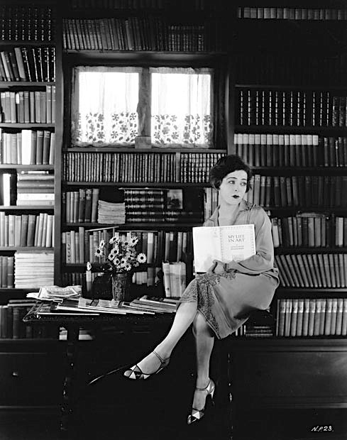 Undated photograph of Alla Nazimova holding a copy of Constantin Stanislavski’s autobiography, My Life in Art, originally published in 1924. / source: Alla Nazimova Society