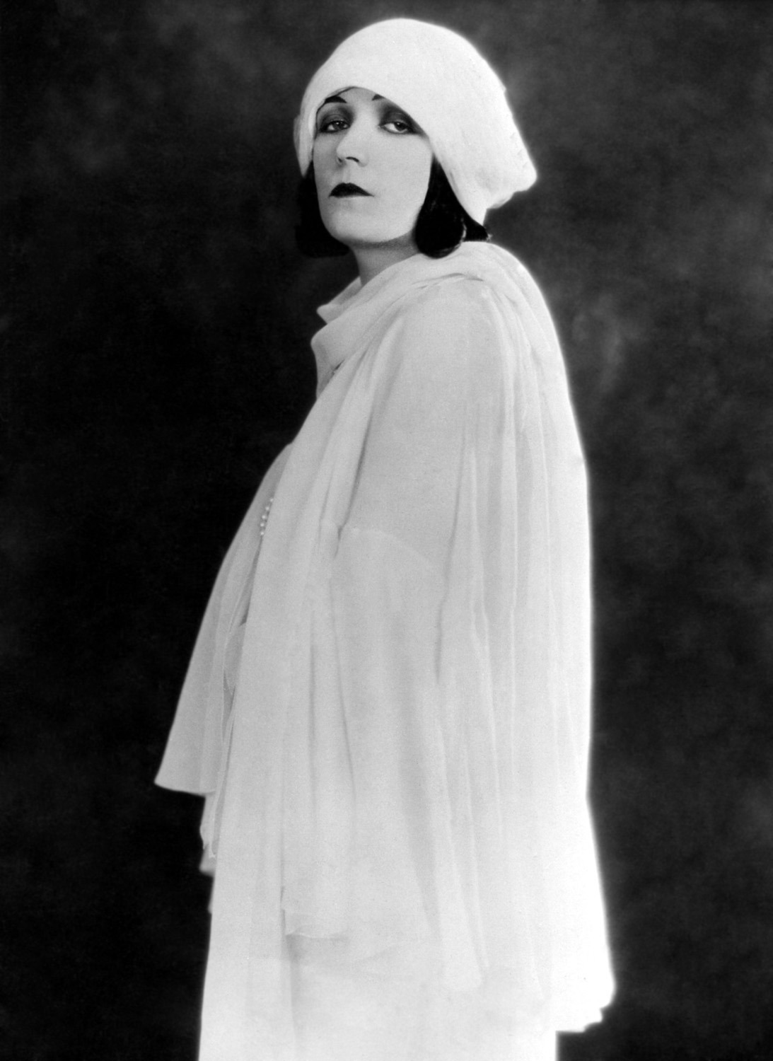 Polish actress Pola Negri wearing white gown and matching headgear, undated / src: Dr. Macro`s movie scans