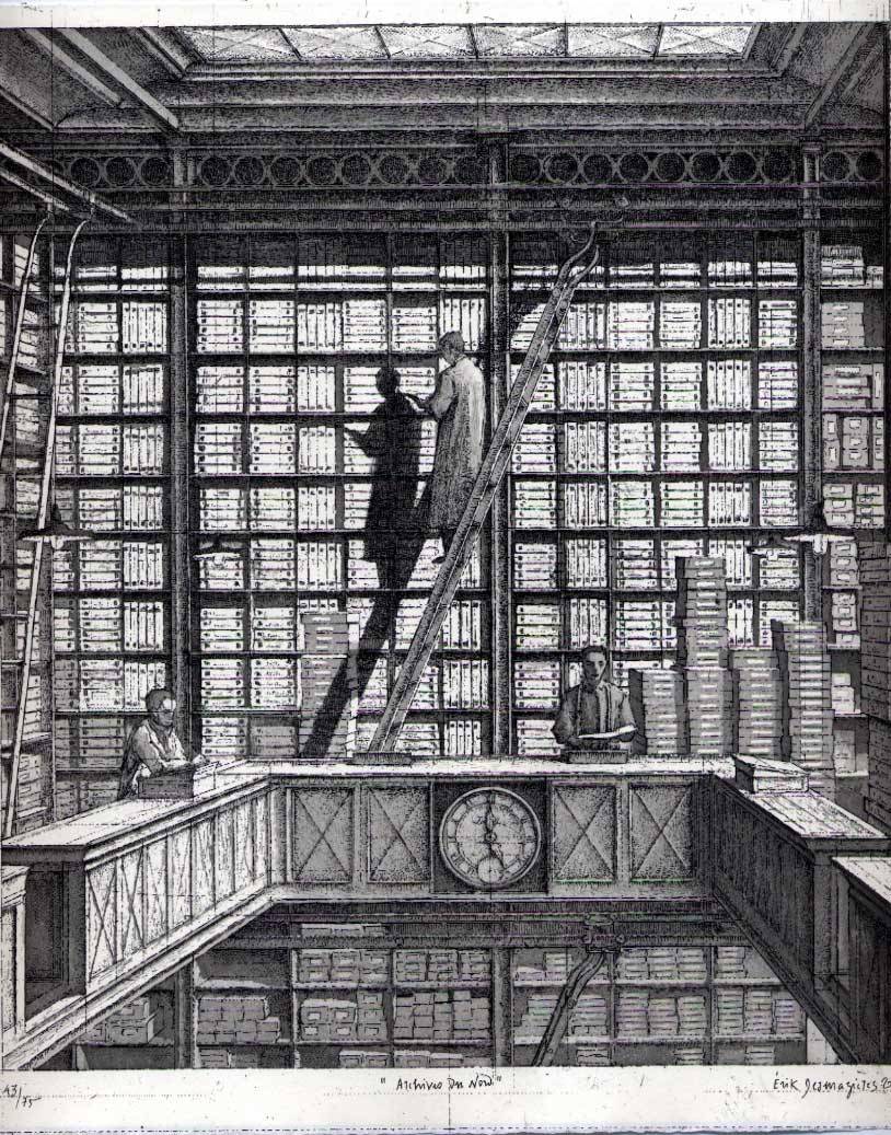 Érik Desmazières :: Archives du Nord. Etching, aquatint & roulette, 2014. From ed/75 for the deluxe edition of Érik Desmazières des mondes gravés, published for the retrospective June 25 – Sept. 21, 2014, at the Musée de l’Hospice Comtesse, Lille / via