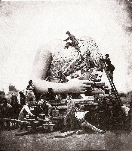 Alois Löcherer :: Moving the colossal statue “Bavaria” (torso), Munich, 1850 [Sculptors: Ludwig Michael Schwanthaler and Ferdinand von Miller] / src: Flickr