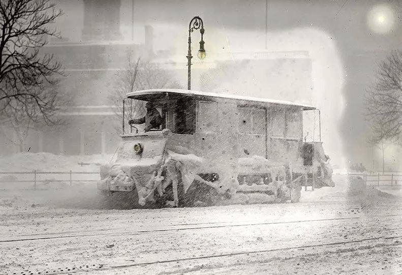 A New York City trolley rolls through a snowstorm in January, 1910.