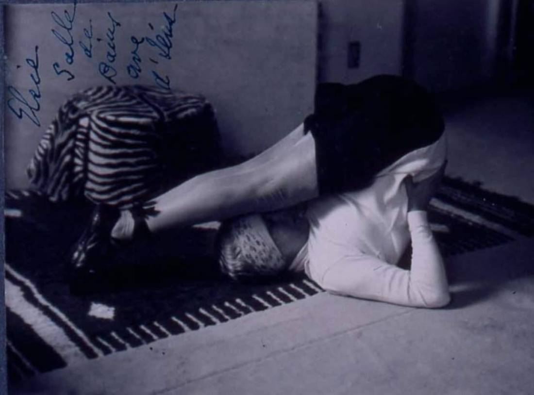 Elsie de Wolfe, designer, doing acrobatics in her “bathroom salon,” 1930′s / via