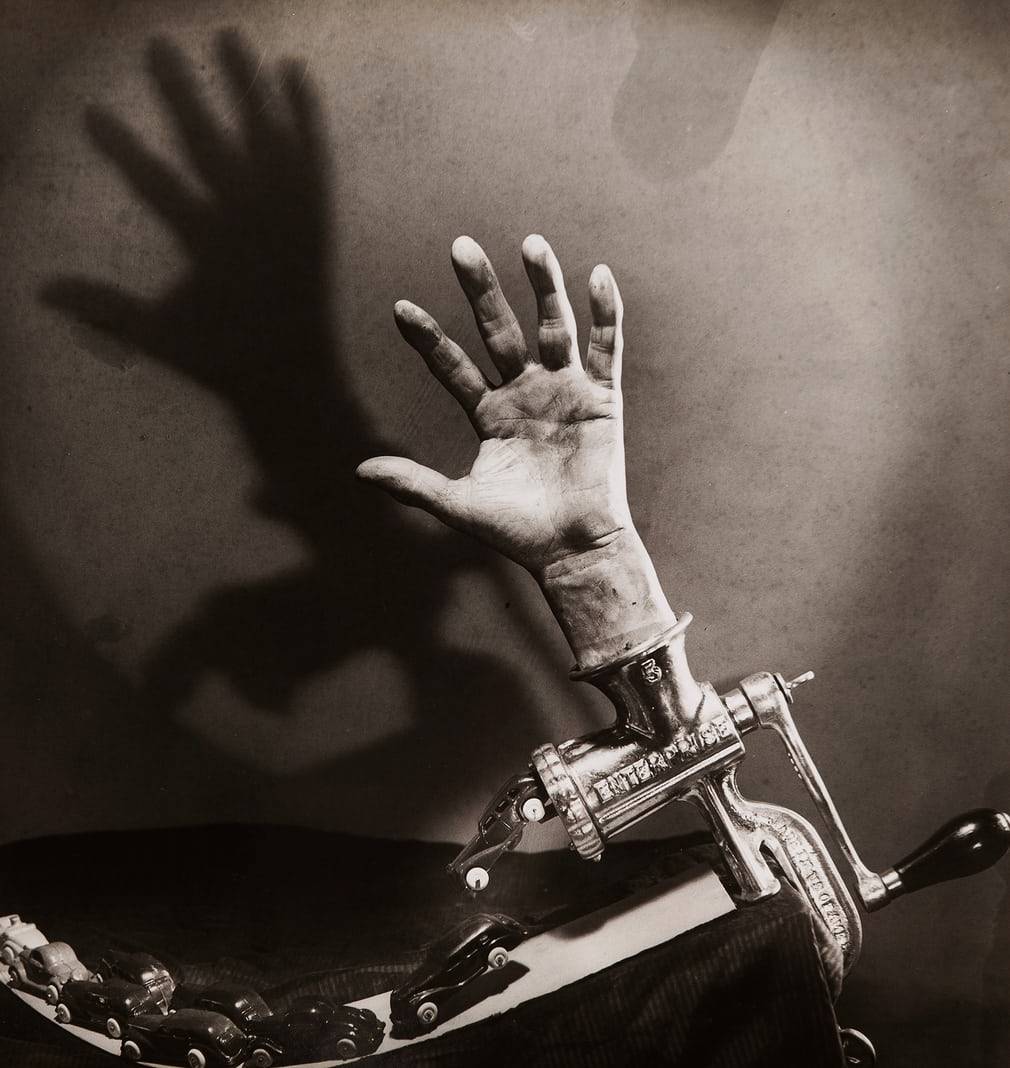 Robert Disraeli, who is best known as a documentary photographer, created a small group of contrived images inspired by Surrealism. Here, industry is introduced as a meat grinder (appropriately, an “Enterprise” brand device) that spits out a stream of automobiles at the cost of the human body. All that remains to be consumed is a hand, fingers spread in a gesture of frightened but futile resistance. The stark shadow of the hand cast on the wall behind recalls cinematic murder scenes. [quoted from source]