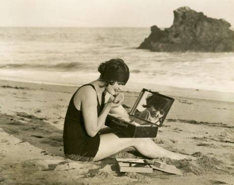 Actress and movie star Vera Steadman sitting in profile at the beach touching up make up. Vintage postcard, 1920s. src: Chuckman Photos