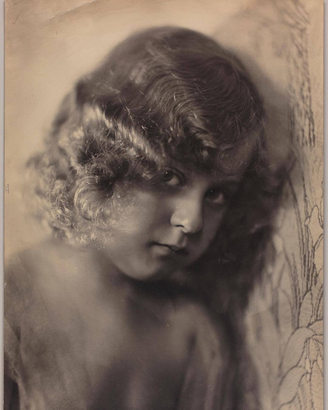 Elias Goldensky :: Girl with curls. Girl resting her head on a floral patterned wall, ca. 1920. Gelatin silver print on Tuma Gas paper. | src Eastman Museum