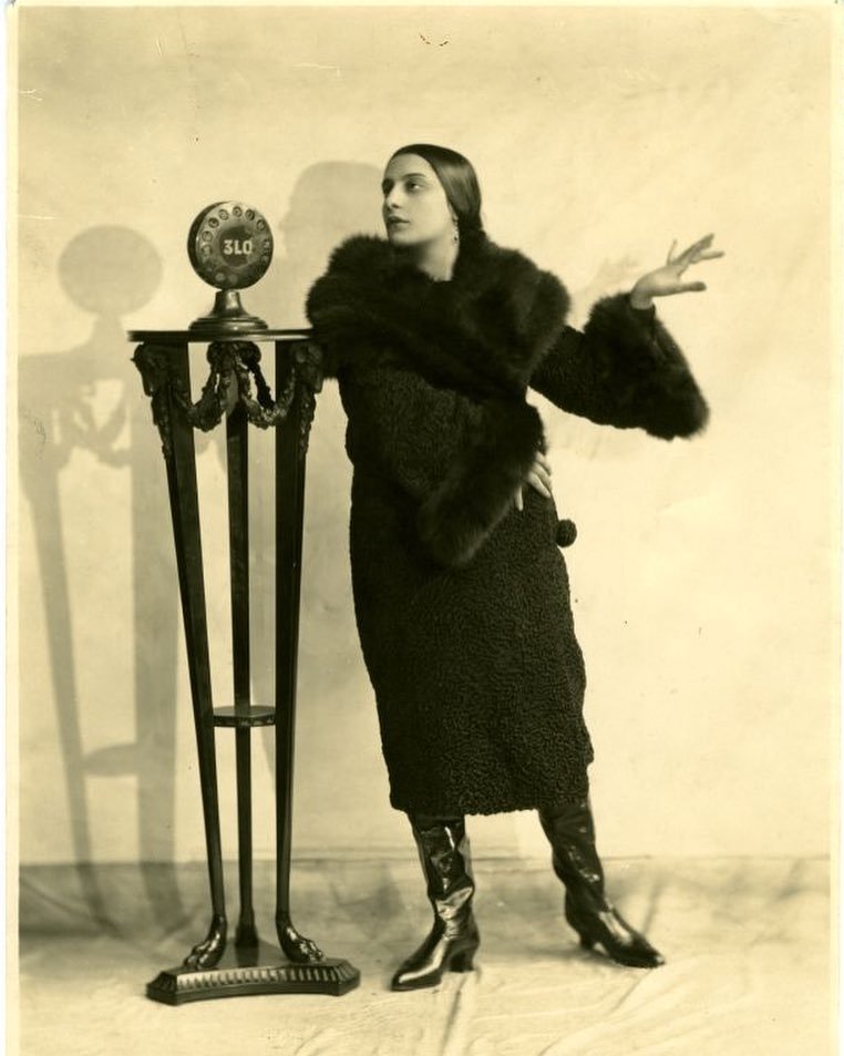 Stephanie Deste in costume as Rose Marie, 1927. Elaborate 3LO microphone stand. | src: ABC. Australian Broadcasting Corp.