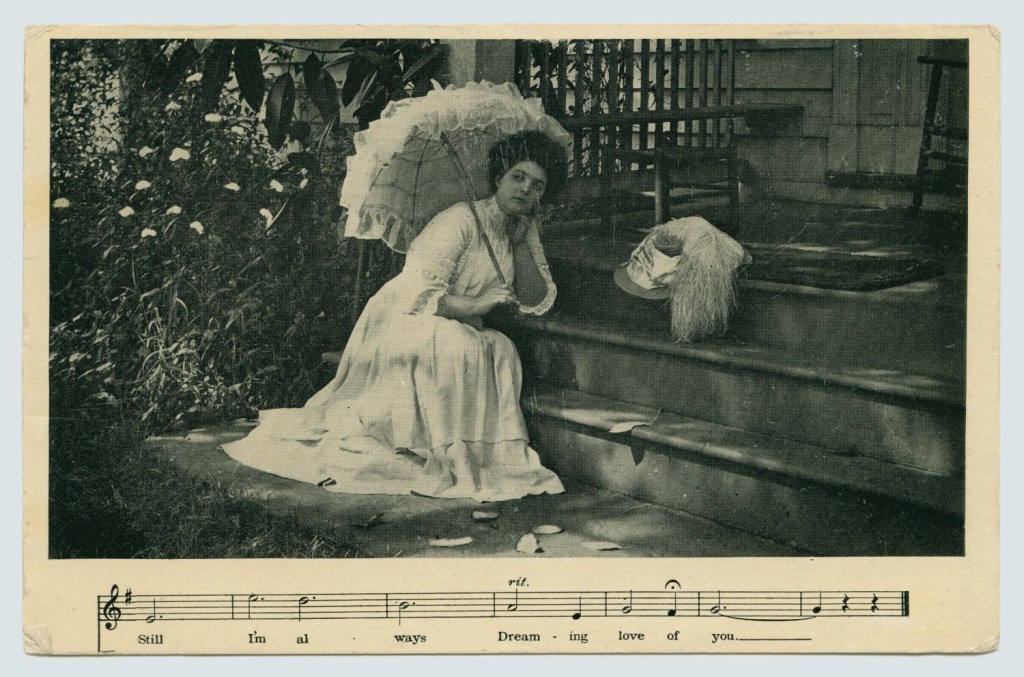 Photo Song Postcard, “Dreaming”. Postcard addressed to Mamie Collins in Central City, Nebraska with a photograph of a woman in a dress, holding an umbrella and sitting on the bottom step on a porch staircase; there are music notes and lyrics printed at the bottom of the card that read: “Still I’m always Dreaming love of you.” | src Texas History