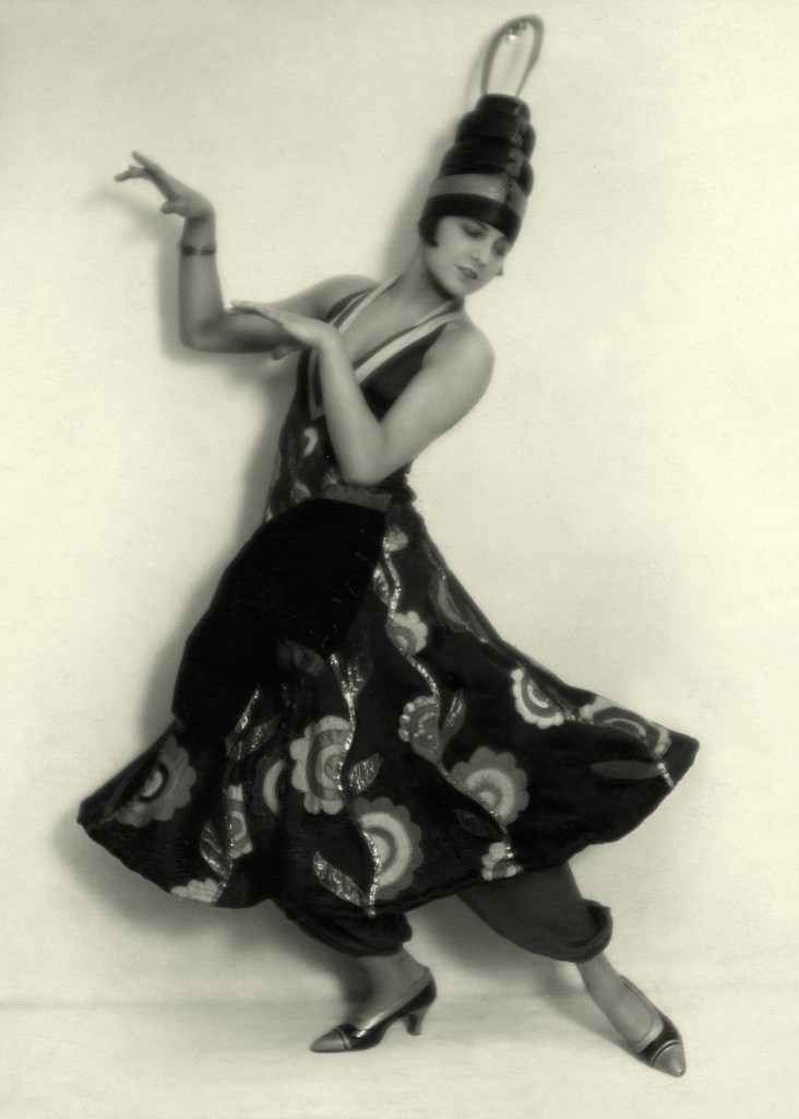 Atelier Balász :: Dancer and actress Henriette Margarethe Hiebel, known as La Jana, full-figure portrait, in a costume decorated with flowers and a hat, 1927. Published in ‘Die Dame’ 08/1927. | src and hi-res Getty Images
