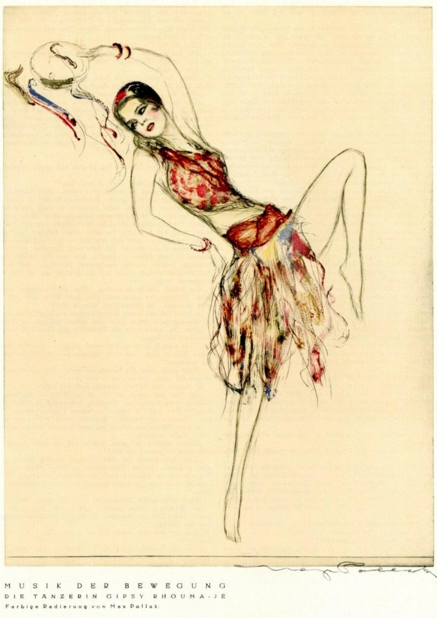 “Musik in der Bewegung – Die Tänzerin Gipsy Rhouma-je”. Kunstdruck nach einer Radierung von / Art print after an etching by Max Pollak. Großer Kunstdruck aus dem Jahr 1932. | src eBay“Music in motion – The dancer Gipsy Rhouma-je”. Kunstdruck nach einer Radierung von / Art print after an etching by Max Pollak. Großer Kunstdruck aus dem Jahr 1932. (Full page) | src eBay