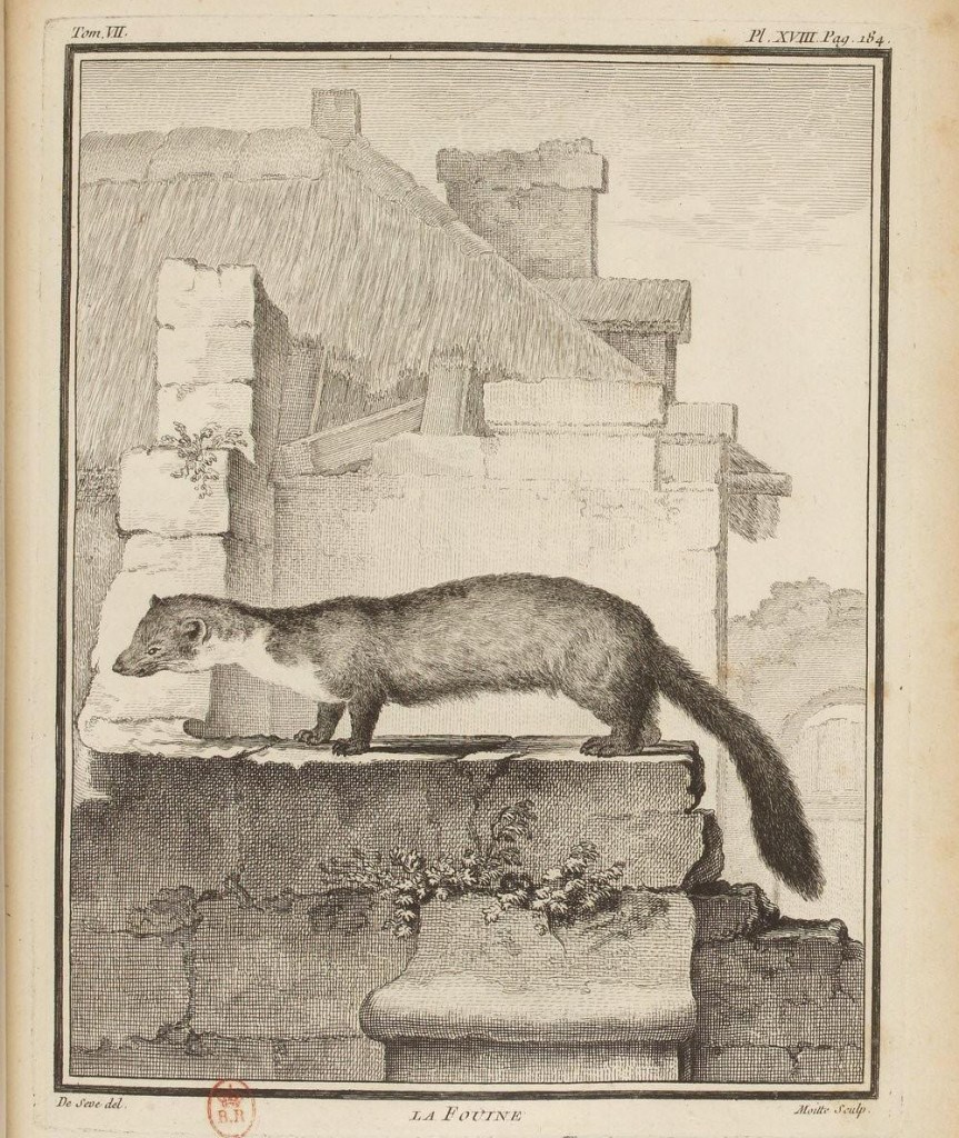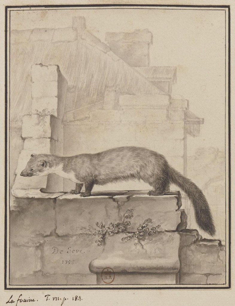 These two drawings are reproductions, with variations, of two drawings by Jacques, kept at the BnF, having been engraved by Pierre-Etienne Moitte (1722-1780). The marten, whose drawing is dated 1756, corresponds to plate XVIII of volume VII, published in 1758.