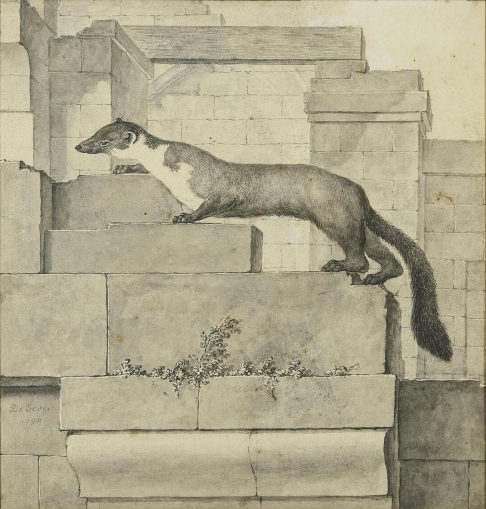 La fouine, 1794 Jacques Eustache de Sève :: La fouine, 1794. Plume et lavis gris sur papier. | The marten (weasel), 1794. Pen and gray wash on paper.| src invaluable