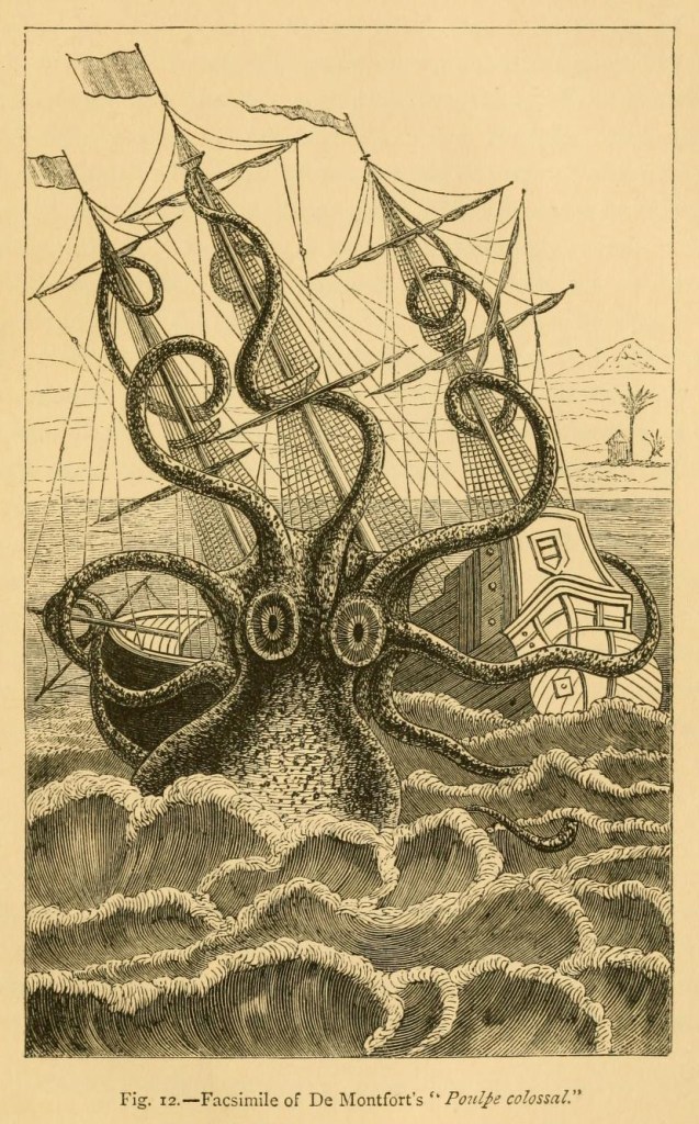 Facsimile of De Monfort’s ‘Poulpe colossal’. Colossal Octopus attacking a sailing vessel off the coast of Angola. Illustration by French naturalist Pierre Denys de Montfort (1766–1820) first published in Histoire Naturelle Générale et Particulière des Mollusques in 1802 as described by Norwegian sailors and American whalers.