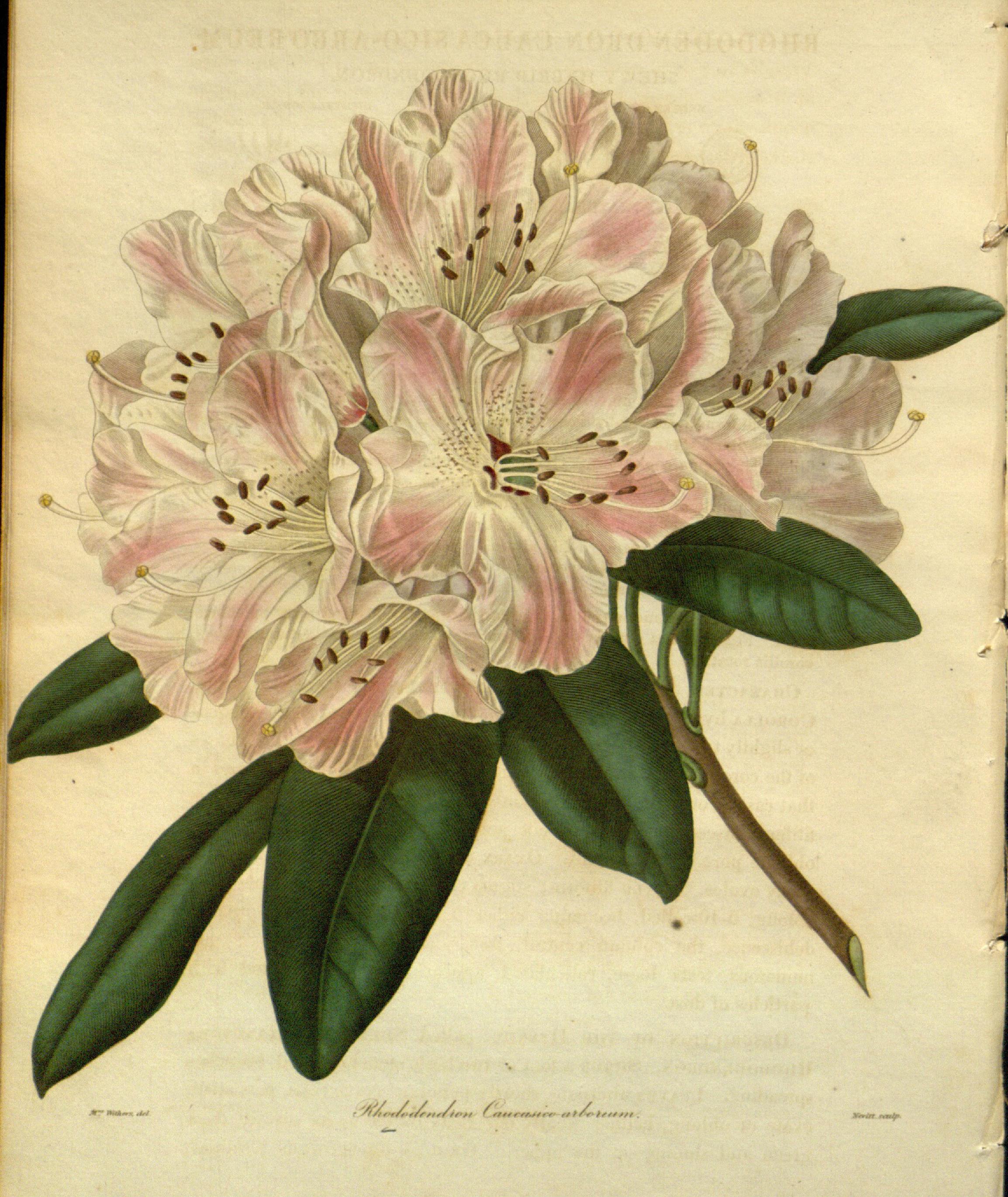 Protea Cynaroides. Artichoke-like flowered Protea. From: The Botanist, vol. 4, 1840.Rhododendron Caucasico-Arboreum ~ Shewy Hybrid Rhododendron The Botanist; containing accurately coloured figures of tender and hardy ornamental plants; with descriptions, scientific and popular; intended to convey both moral and intellectual gratification. Vol. 4, 1840. | src internet archive