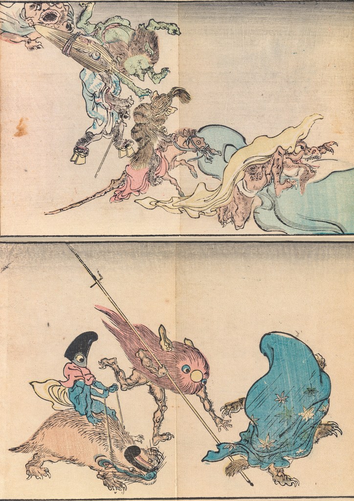 Artist: Kawanabe Kyōsai 河鍋暁斎 (1831-1889) Title: Kyōsai hyakki gadan 暁斎百鬼画談 (1889 and 1890 editions) Publishers: Inokuchi Matsunosuke and Kaishinrō Medium: Woodblock printed book (gajōsō / orihon, accordion-style binding), ink and color on paper. image source: The Met and The Arthur Tress Collection at Kislak Center, University of Pennsylvania Libraries image on top from this edition: Kyōsai’s Pictures of One Hundred Demons. Painted by Kawanabe Tōiku Sensei. August, Meiji 23 (1890)