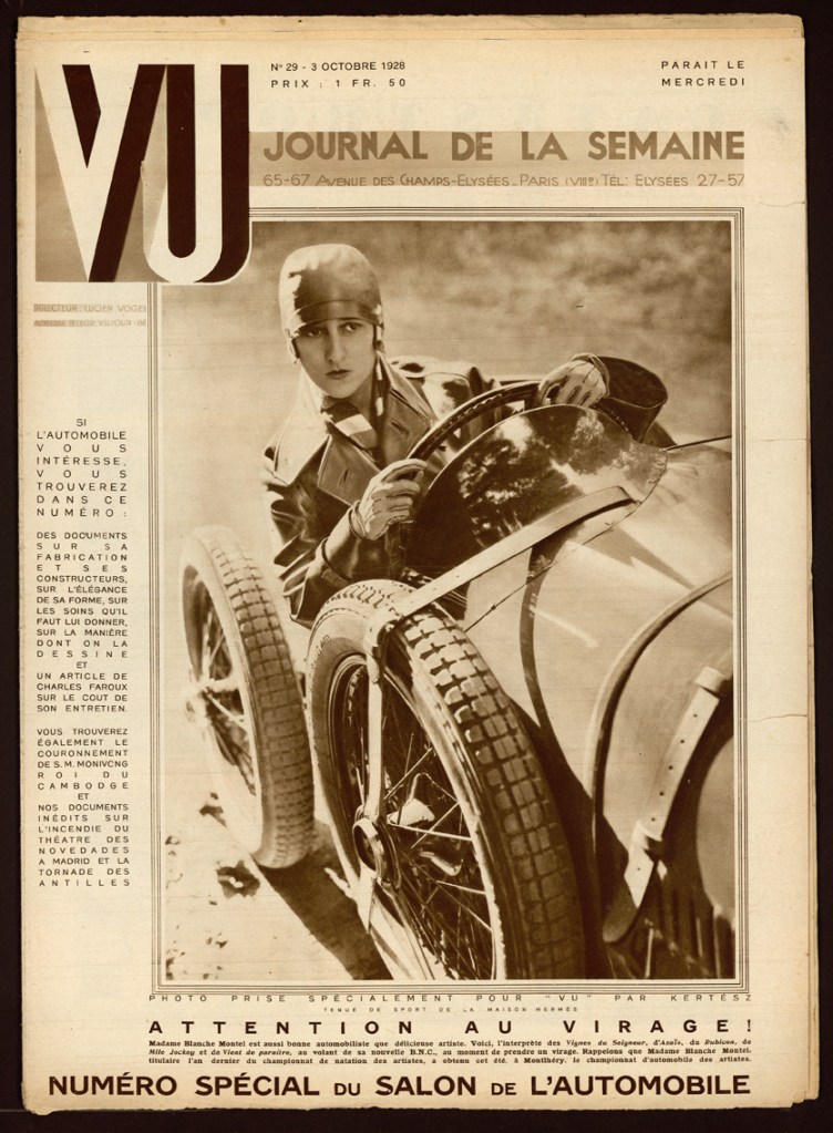 André Kertész :: Attention au virage (‘Watch the bend’). Actress Blanche Montel. Vu. Numéro spécial du Salon de l’automobile (n. 029), 3 octobre 1928. | src Musée Nicéphore-Niépce