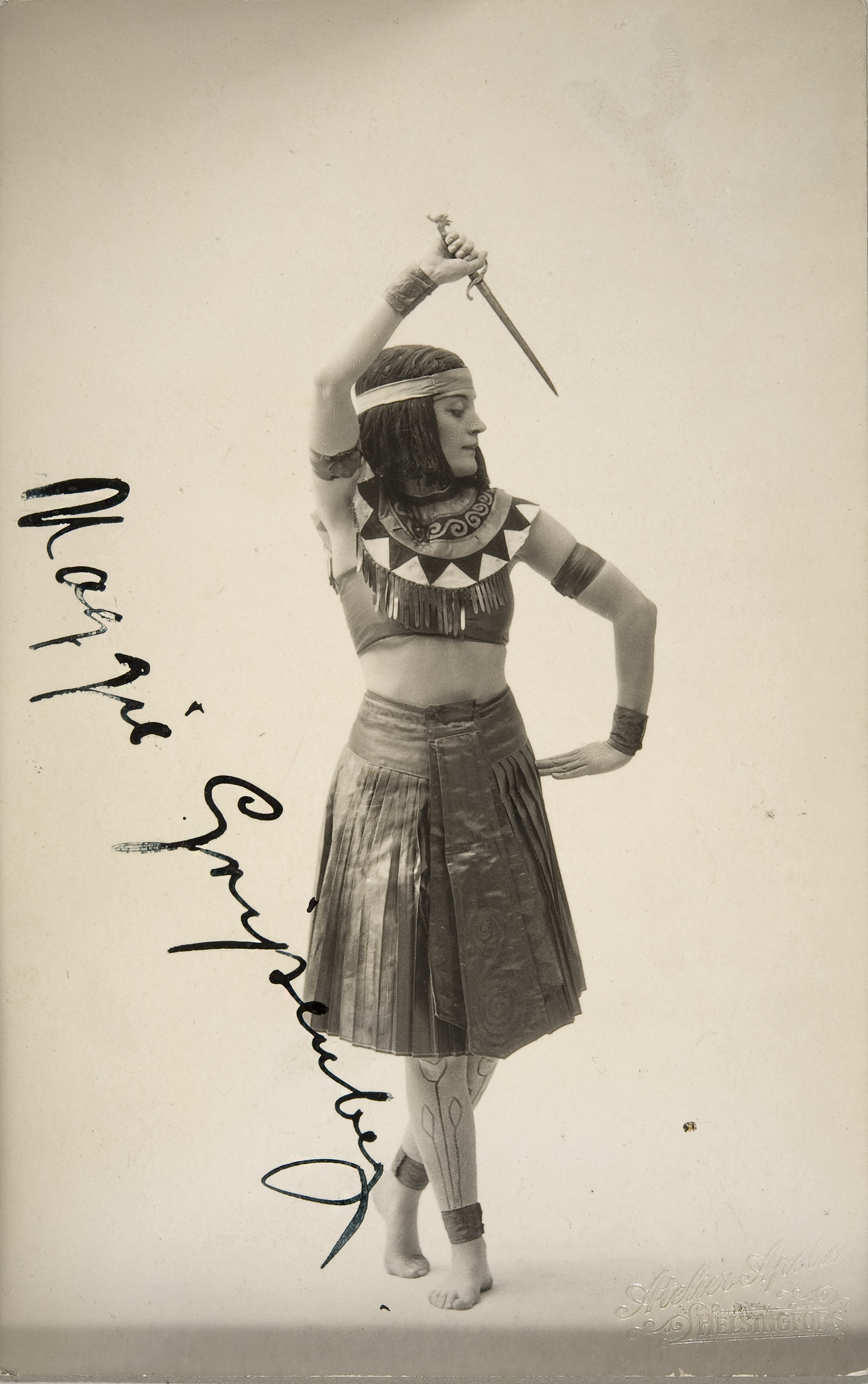Atelier Apollo :: Maggie Gripenberg tanssii Verdin ‘Aida’ -oopperassa 1919. Esitys oli samalla oopperan kauden 1919 avajaisjuhlanäytäntö. | Maggie Gripenberg dances at Verdi’s ‘Aida’ in 1919. The performance was at the opening ceremony of the 1919 opera season. Blind-stamp: “Atelier Apollo Helsingfors” | src FHA – Museovirasto