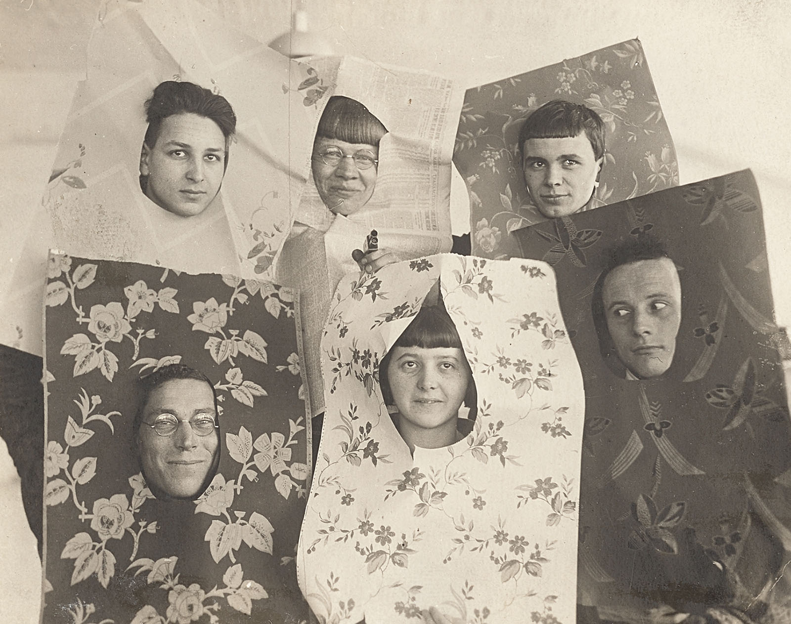 Five students wearing sheets of wallpaper and one wearing a sheet of newspaper (ca. 1927-28), attributed to Edmund Collein