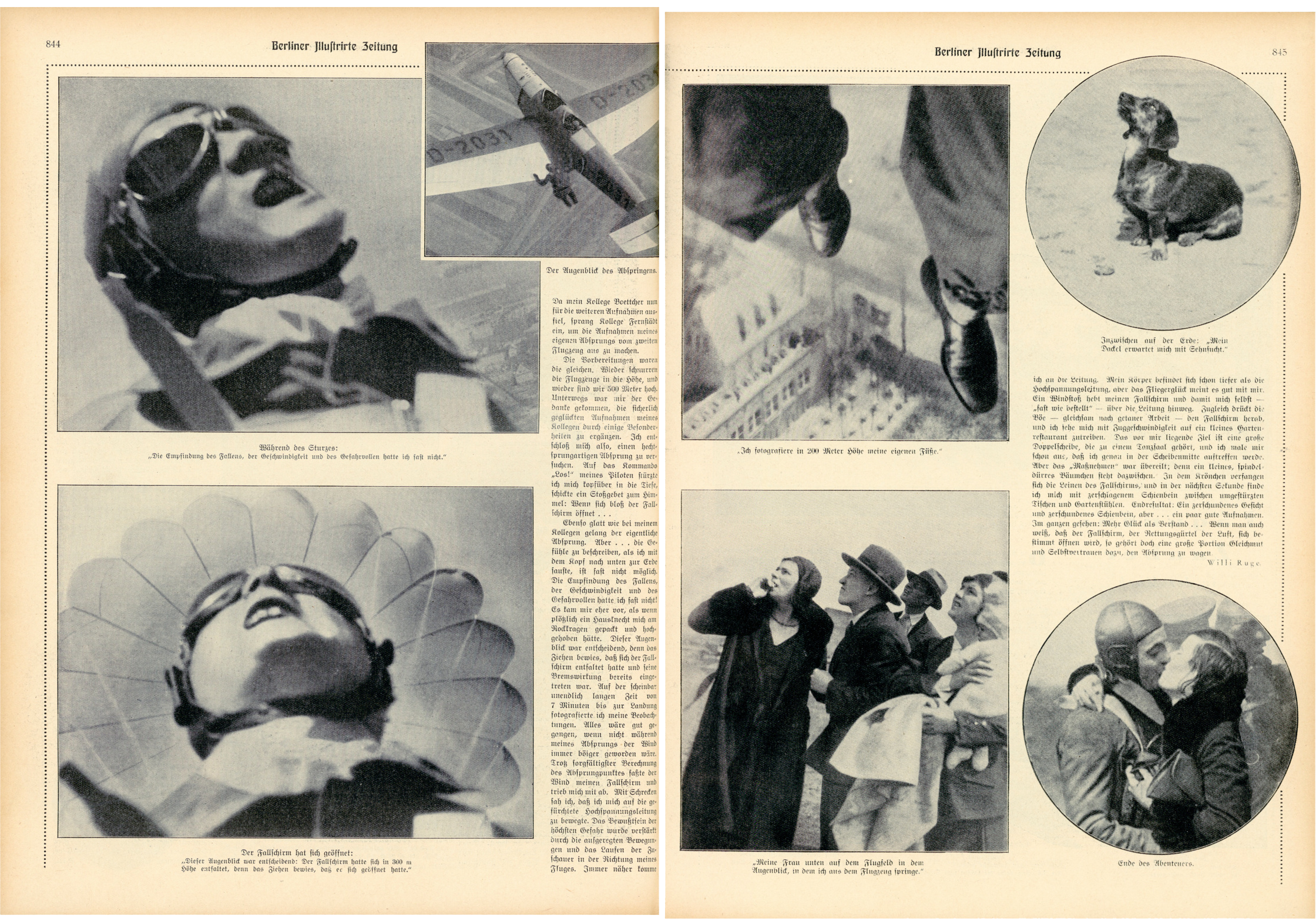 Willi Ruge :: Seconds before Landing, from the Series ‘I Photograph Myself during a Parachute Jump’,1931 | src MoMAWilli Ruge :: Seconds before Landing, from the Series ‘I Photograph Myself during a Parachute Jump’,1931 | src MoMAWilli Ruge :: Photo of Myself at the Moment of My Jump. From the series I Photograph Myself during a Parachute Jump, 1931. Gelatin silver print. | MoMAWilli Ruge :: Photo of Myself at the Moment of My Jump. From the series I Photograph Myself during a Parachute Jump, 1931. Gelatin silver print. | MoMAWilli Ruge :: With my head hanging before the parachute opened, from the Series ‘I Photograph Myself during a Parachute Jump’,1931 | src MoMARuge, Willi. “Ich fotografiere mich beim Absturz mit dem Fallschirm.” Berliner Illustrirte Zeitung 40, no. 21 (May 24, 1931): 844 (as Während des Sturzes, and Die Empfindung der Geschwindigkeit und des Gefahrvollen hatte ich faßt nicht). “I’m photographing myself during a parachute jump” Berliner Illustrirte Zeitung 40, nº 21 (May 24, 1931): 844 (During the fall, and I hardly had the feeling of speed and danger). | src MoMAGarland E. Cain :: Autoportrait en parachute. États-Unis, vers 1930. Tirage argentique. | src Lumière des roses – 16e Livraison