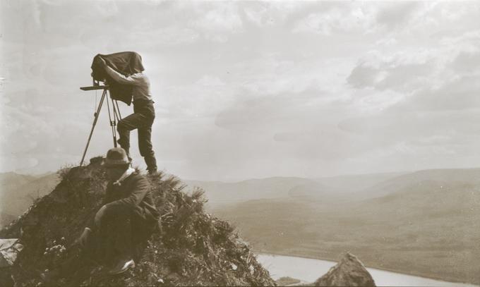 Unknown photographer. Two men on top of Eagle Bluff in Eagle, Alaska. One man identified as C.L. Andrews stands with his head covered by a camera cloth (camera mounted on a tripod), 1900-1910. | src | src C. L. Andrews photographs, 1880s-1948 ~ University of Oregon ~ Oregon Digital Libraries
