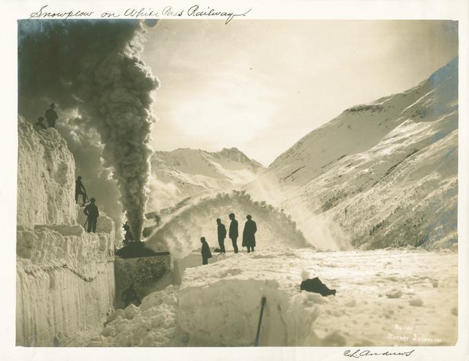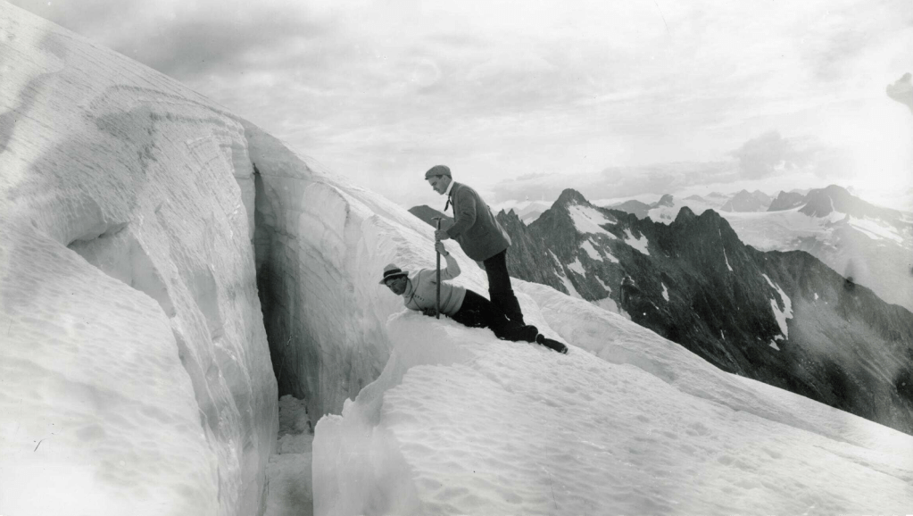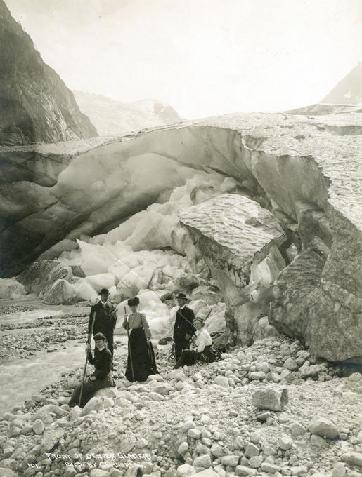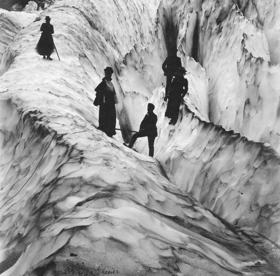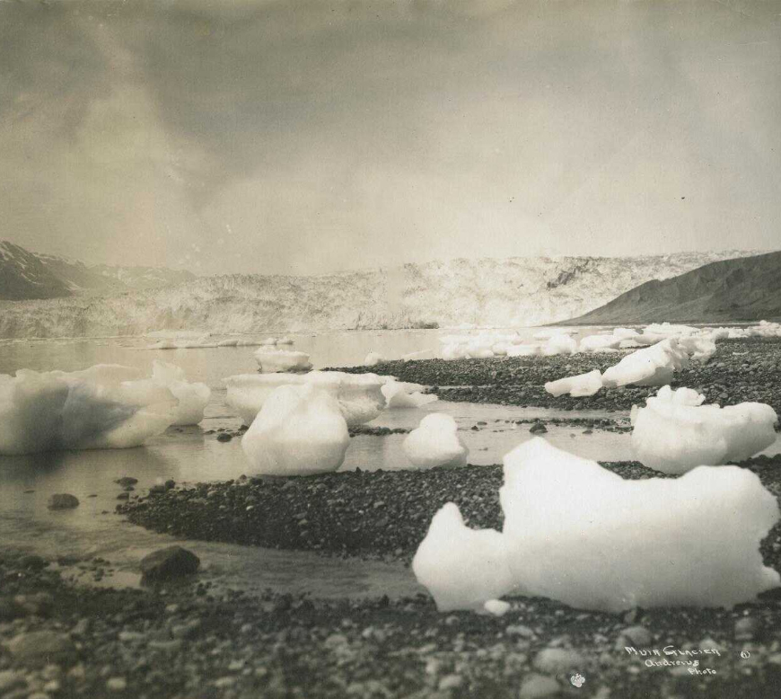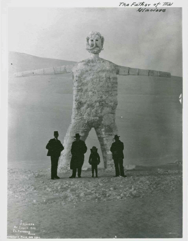 Clarence Leroy Andrews :: The Father of the Glaciers (Snowman at Summit, 1902. Waggoner, Muir and Howe, written on low margin), Muir Glacier, Alaska, 1902. | src University of Oregon Digital Libraries