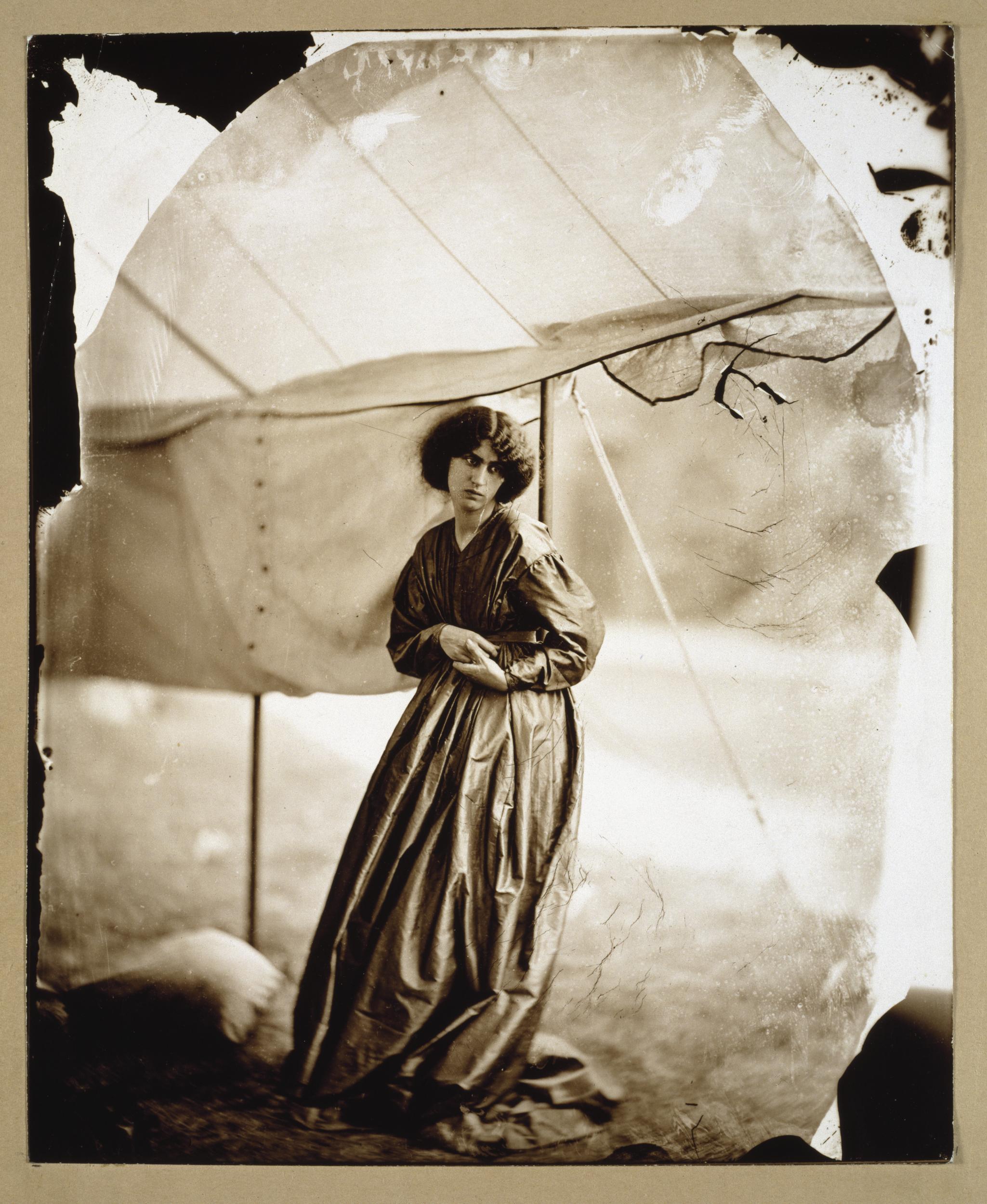 This picture is one of the most remarkable in the series, especially the two prints that are preserved in the Victoria and Albert album. Mrs. Morris is posed outdoors against the backdrop of a billowing canopy, with her hands clasped at her midriff. She is turned facing the camera, though she looks away to the right. The other V&A print [image # 3] is cropped down from the original negative, as is the Birmingham copy. The modern prints shows the composition of the original negative and is far the more dramatic and dynamic image, though the cropped version is also interesting and effective, not least because of certain ghostly internal “framing” effects (these appear on several other of the pictures in the series). The Birmingham print, which is a replica of the cropped version, does not display this framing effect.
