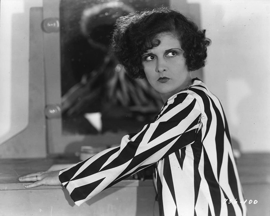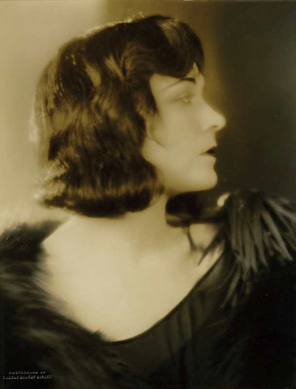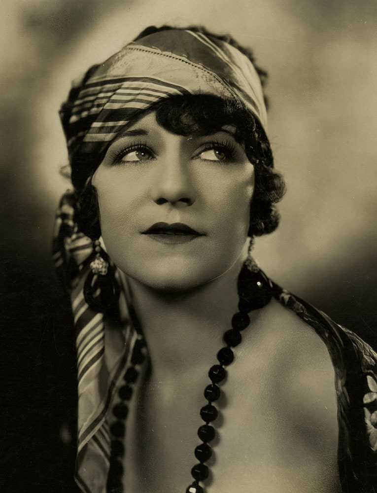 Eugene Robert Richee :: Paramount Pictures personality portrait of silent film actress Viola Dana. Dana poses as a vampy flapper with a scarf tied around her cropped locks and beaded costume jewellery that pops against her tantalizingly exposed décolletage, 1920′s (Paramount Pictures ink stamps on verso) | src eBay | originally posted on tumblr