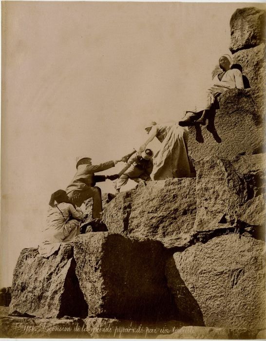 Ascent of the great pyramid, 1875 Felix Bonfils :: Ascension de la grande pyramide par un touriste, Egypte, 1875. | Ascent of the great pyramid by a tourist, Egypt, 1875. Albumen paper process. | src Catawiki