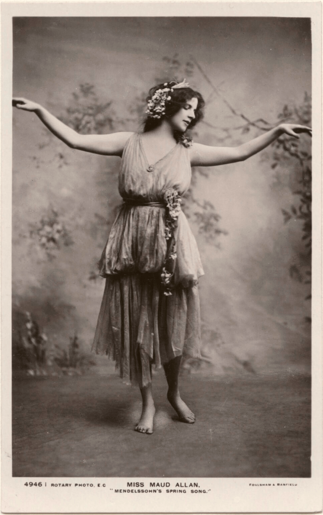 Foulsham & Banfield :: Maud Allan dancing to ‘Mendelssohn’s Spring Song’, 1908. Bromide postcard print, published by Rotary Photographic Co. Ltd. | src NPG
