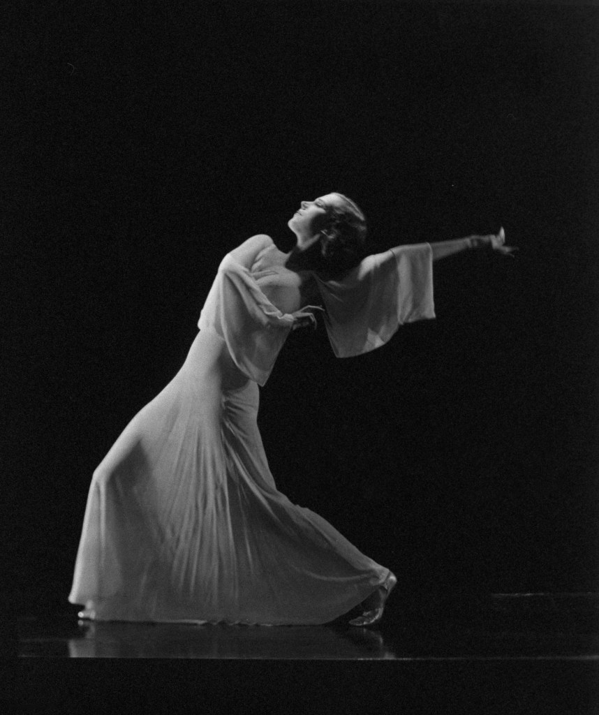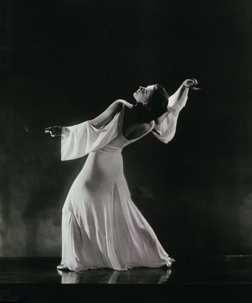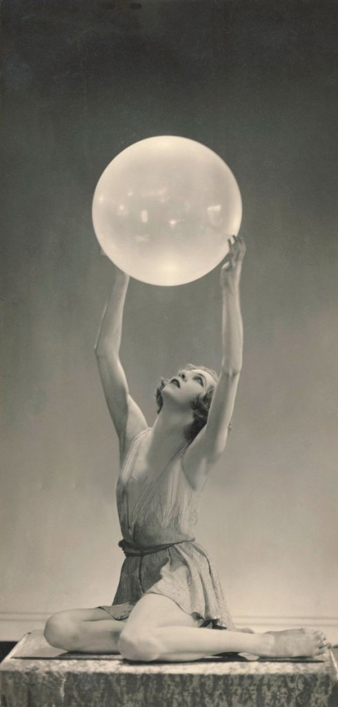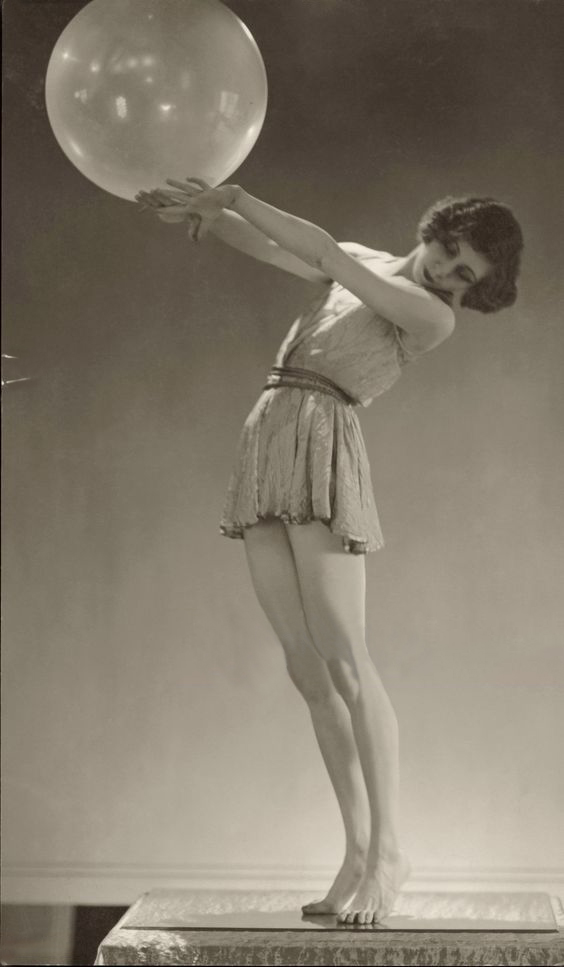 George Hoyningen-Huene :: Georgia Graves, Folies-Bergère dancer, wearing sleeveless, upper-thigh-length chiffon dance dress, standing on tip-toe, holding large translucent ball on outstretched hands. Published in Vogue, 1928. | src CondéNast via Getty Images