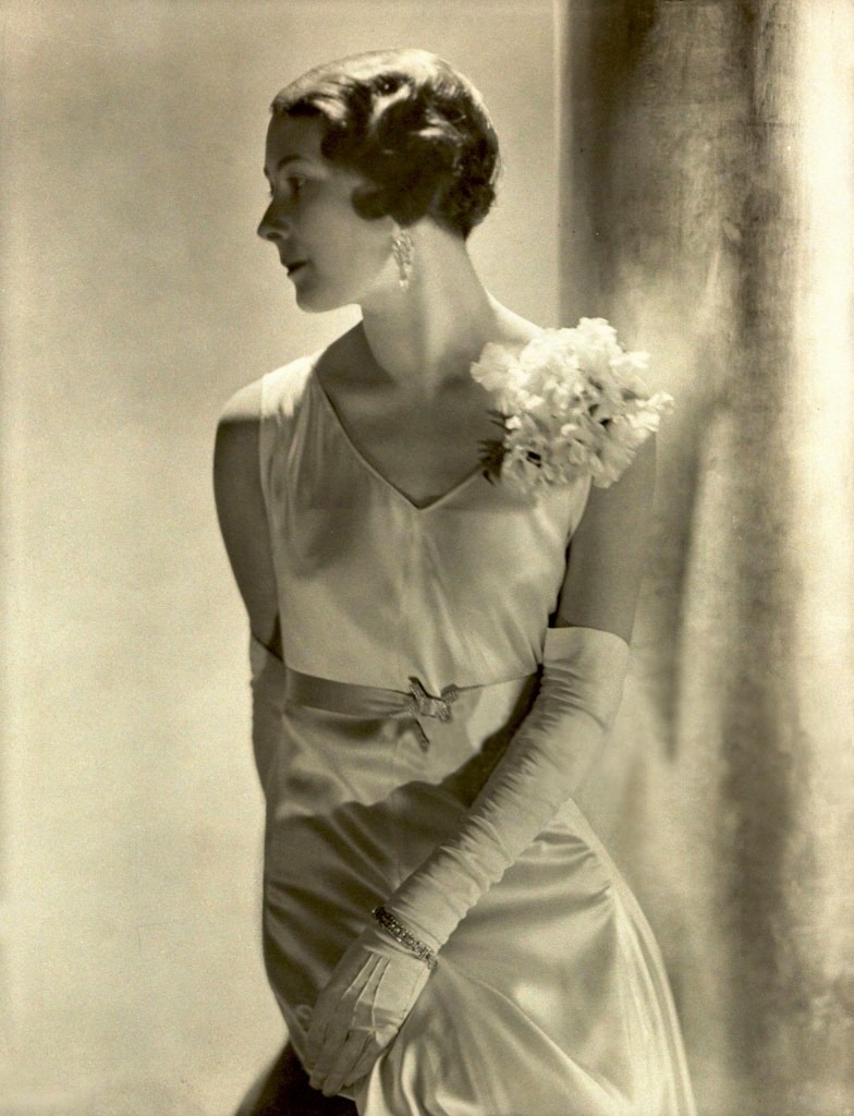 George Hoyningen-Huene :: Actress Brigitte Helm, standing in profile with arm around a column, wearing a printed metallic garment resembling Greek dress, with her hair in tight curls around her forehead. Vanity Fair, 1930s. | src and hi-res Getty Images