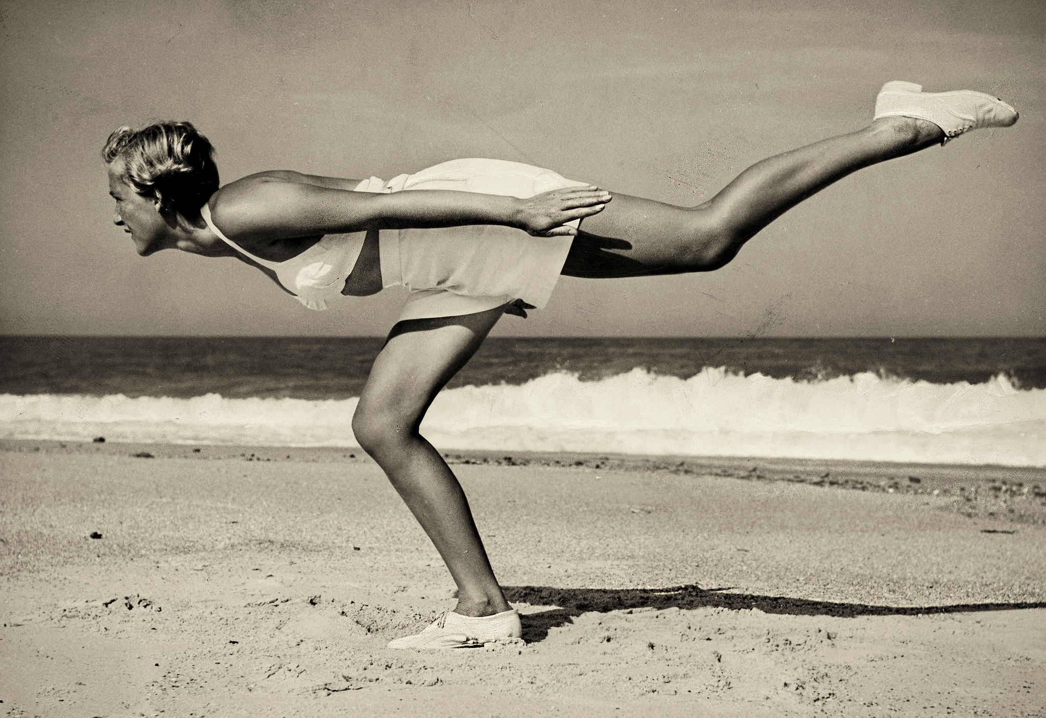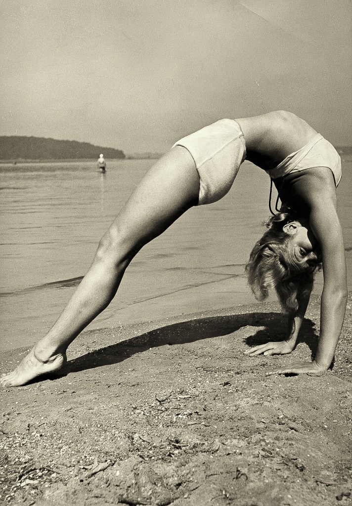 Gerhard Riebicke :: Sports, gymnastics, a woman at gymnastics exercises on the beach, ca. 1940. Published by ‘Die Gruene Post’ 31/1940. | src Getty Images