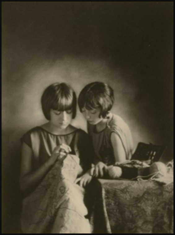 Jean Arriat :: “La leçon de broderie”, ca. 1930. Original charbon Fresson print for the exhibition, mounted on cardboard, signed and captioned in pencil on the mounting. On verso: admission label to the XXVe Salon International d’Art Photographique, Paris, October 1930. | src Millon ~Drouot