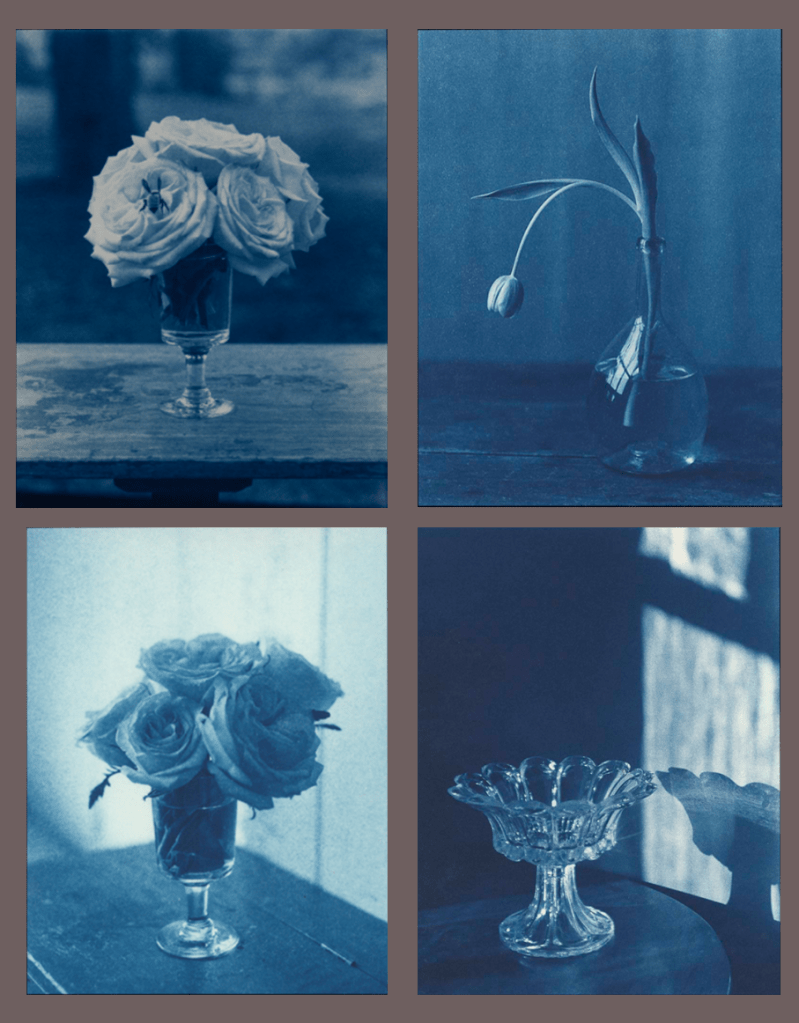 John Dugdale :: Still Lifes (clockwise): Wonder Stings Me More than the Bee, ca. 1999 / Lone Tulip, ca. 2000 / A Certain Slant of Light, ca. 1999 / Offering, ca. 1999. Cyanotypes. | src John Dugdale Studio