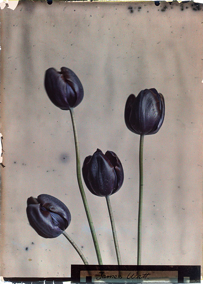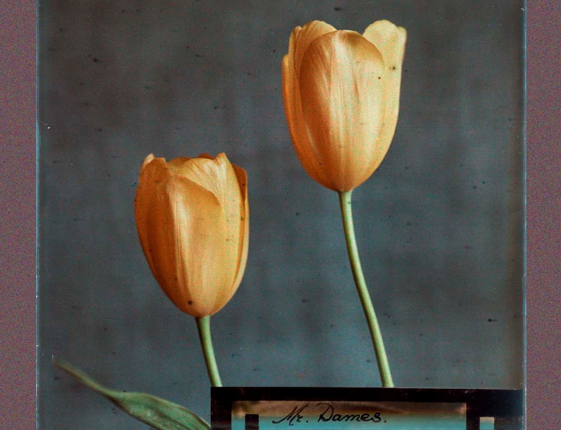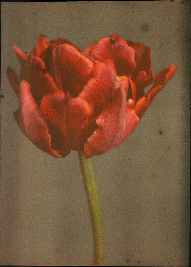 Blok applied this first practical color process to photograph flowers for Dutch growers in the Bollenstreek. Using orange, violet and green colored very fine potato starch granules which act as a filter and which are applied to a black and white positive on glass, an image is created that can be viewed as a color slide. | src Nationaal Archief ~ Collectie Spaarnestad and Flow Magazine