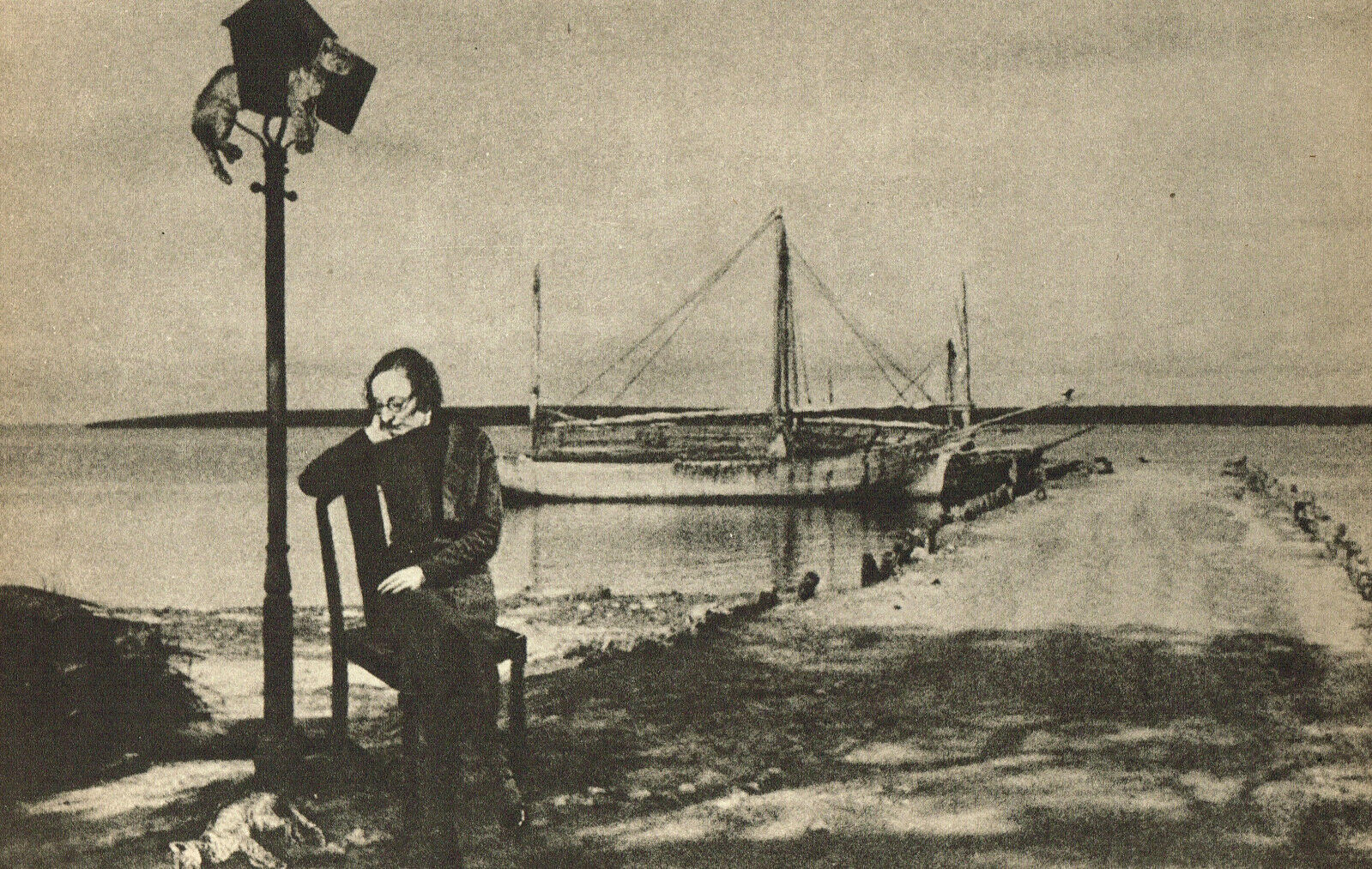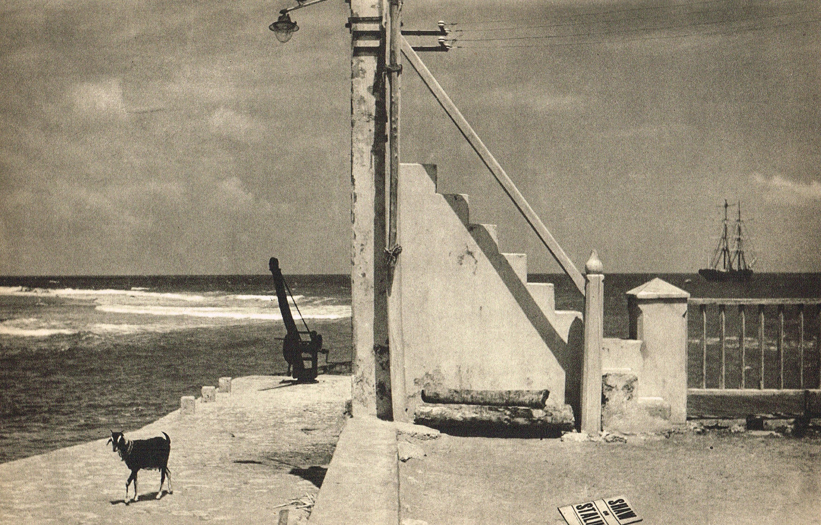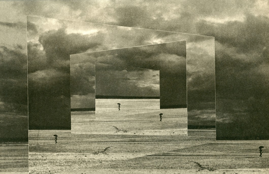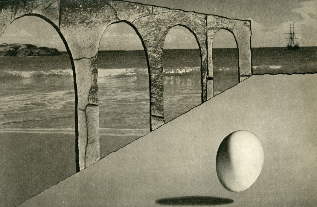 Wendt’s photomontage has been most conventionally and variously comprehended through its pastiche of influences and motifs such as De Chirico’s futurist arches, Magritte’s “Ceci n’est pas un oeuf,” Piero della Francesca’s Brera Madonna, Georges Bataille’s rumination on the story of the eye, and the recurrent vignette of a distant brig. Although he clearly held great admiration for those artistic circles he came into contact with in Europe, it seems a bit too summary merely to insert him within these narratives. (quoted from source)