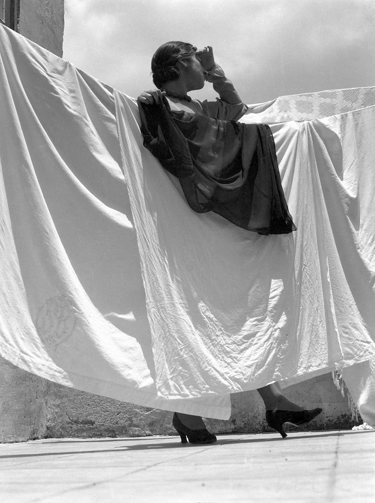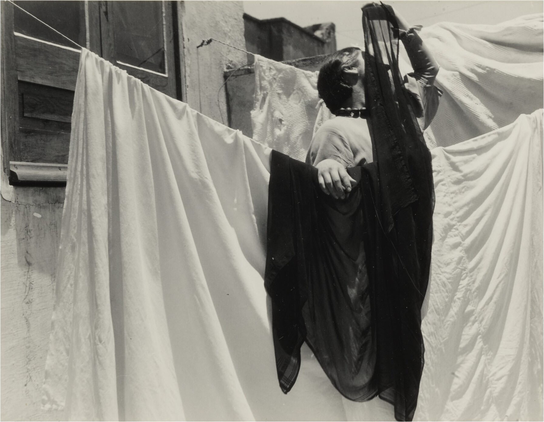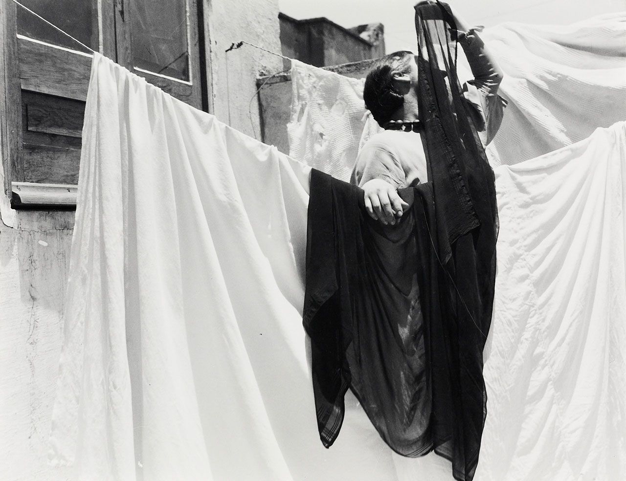 Alvarez Bravo made many images of linens and clotheslines, exploring the interplay between draped fabric and angular architecture. Here, the addition of a figure, seemingly engaged in a performance, adds mystery and animation to an otherwise formal study. | text: Getty museum