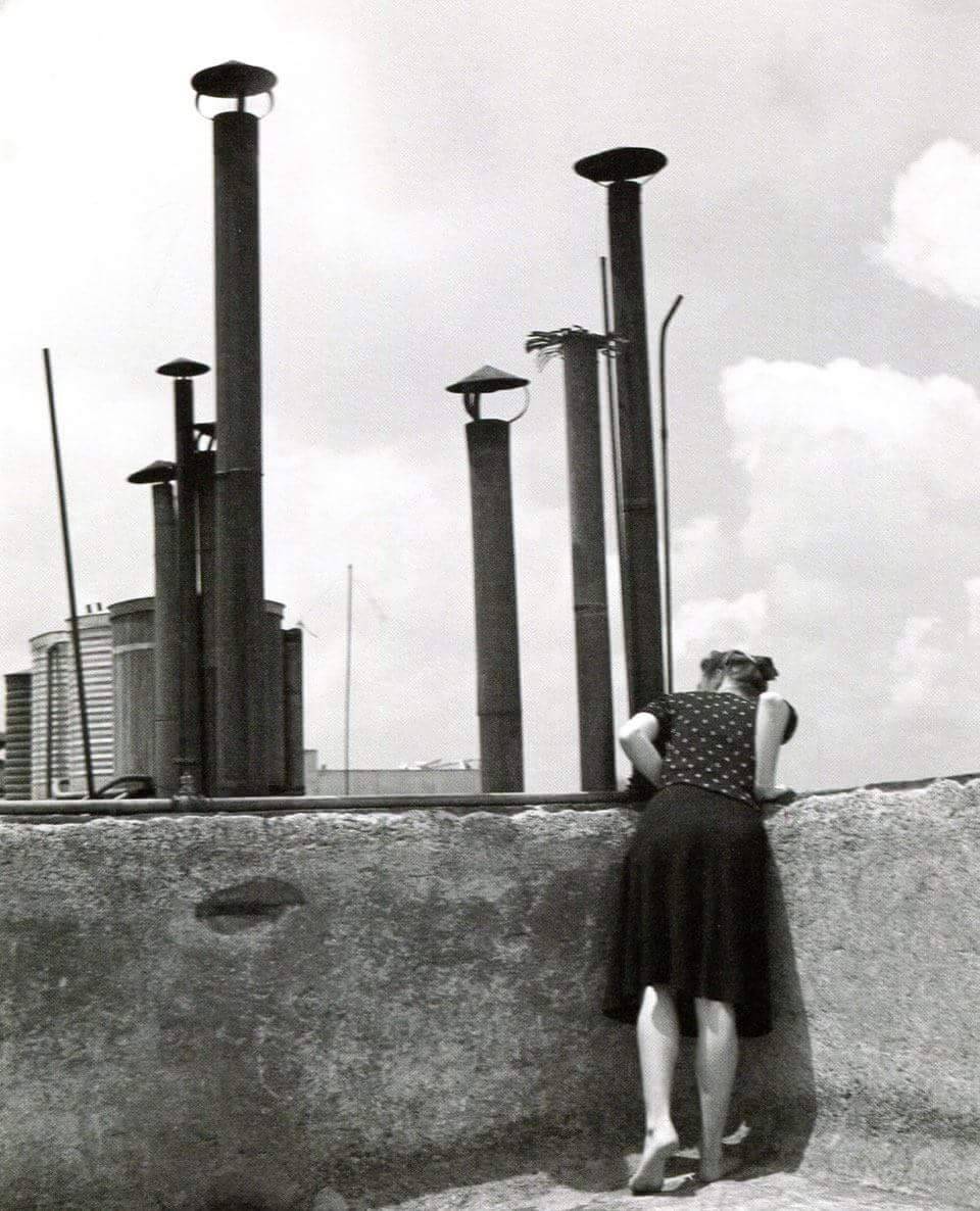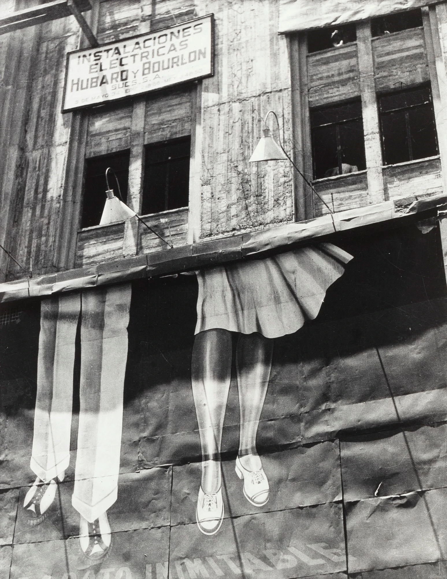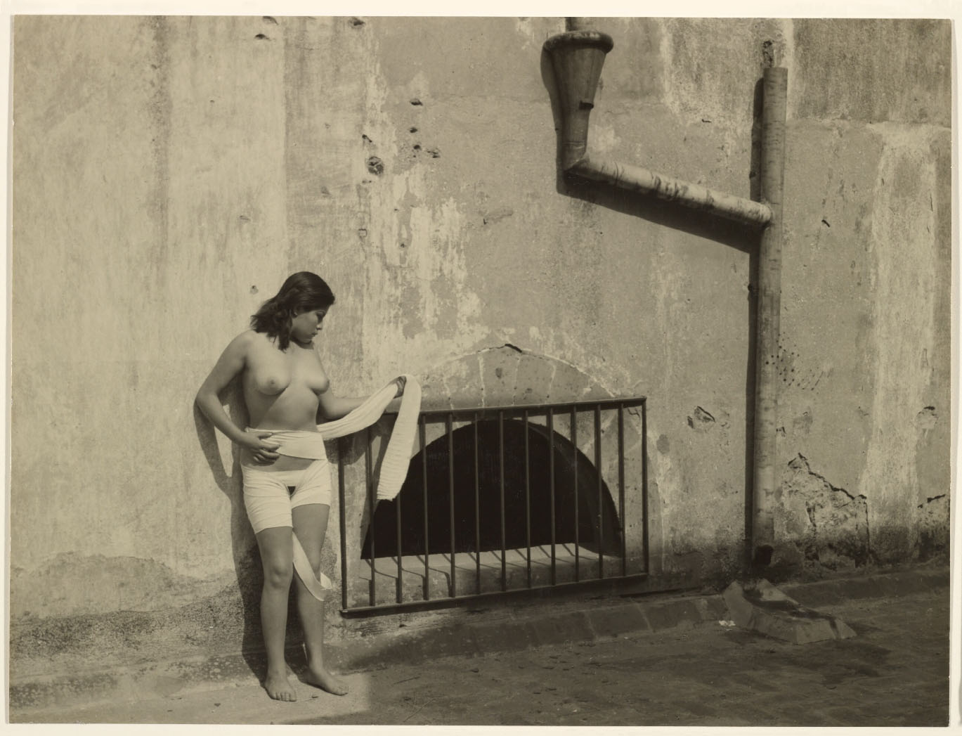 Alvarez Bravo made many images of linens and clotheslines, exploring the interplay between draped fabric and angular architecture. Here, the addition of a figure, seemingly engaged in a performance, adds mystery and animation to an otherwise formal study. | text: Getty museum