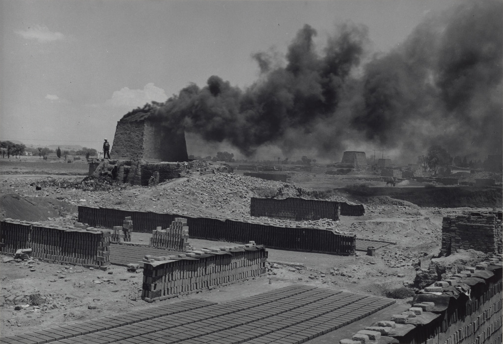 Billowing, black smoke fills the sky, obscuring the grazing burro on the right, in this photograph of an adobe brick kiln. Manuel Alvarez Bravo called this image La Quema, a term meaning “the fire” or “the burning.” Depicting a landscape threatened by human industry, the image may symbolize more sinister historical events. Alvarez Bravo, who came of age during the violent Revolution of 1910-1920, often saw dead bodies burning in the street.