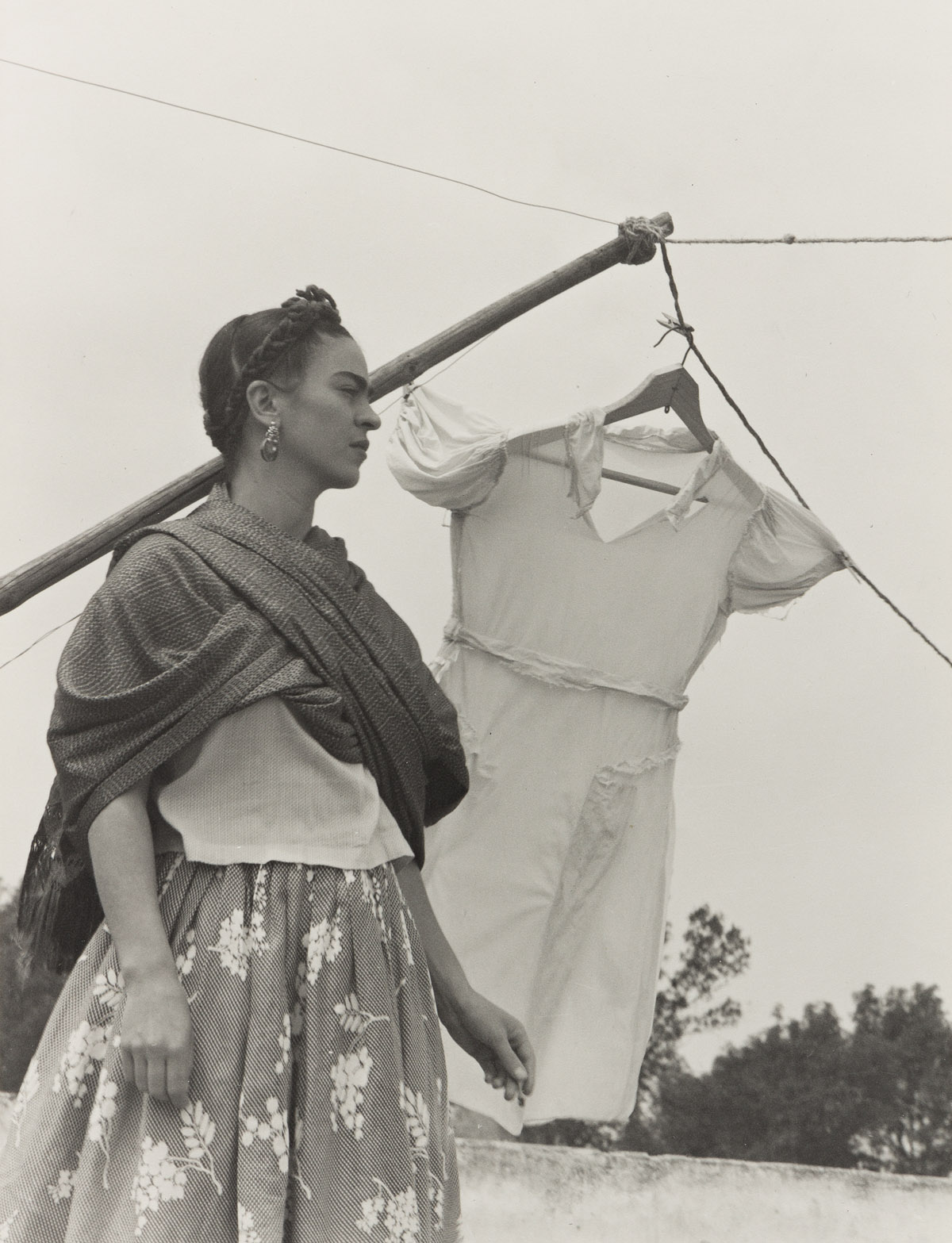 In El eclipse (1933), Álvarez Bravo achieved a dynamic geometry of crisscrossing diagonals. Standing on a shallow corner of a rooftop, a woman is partially concealed by sheets bleaching in the sun and by her dark rebozo, which she presumably holds in front of her face to look at an eclipse. His carefully composed images reveal his modern sense of aesthetics. | text Blanton Museum of Art Collections