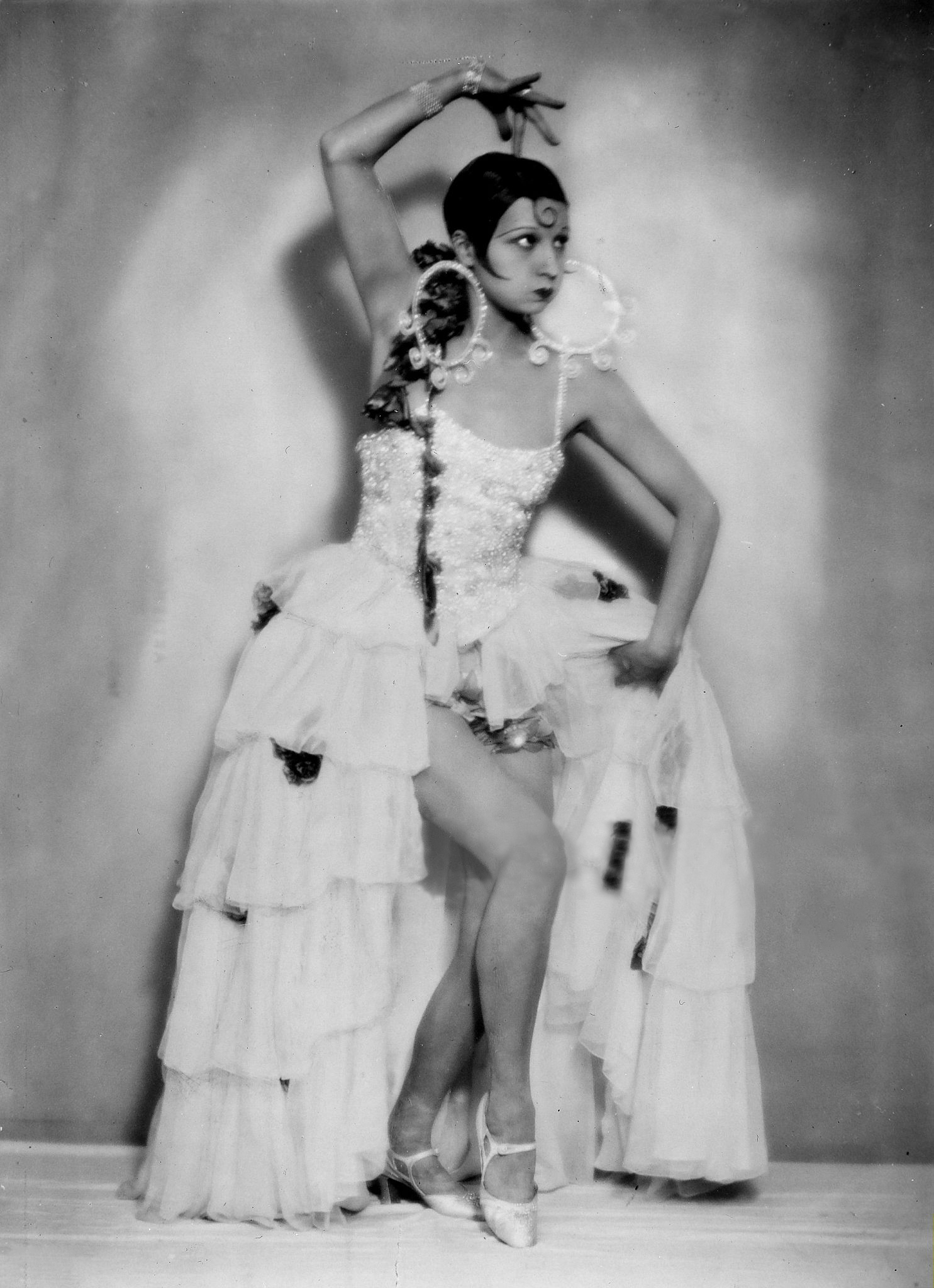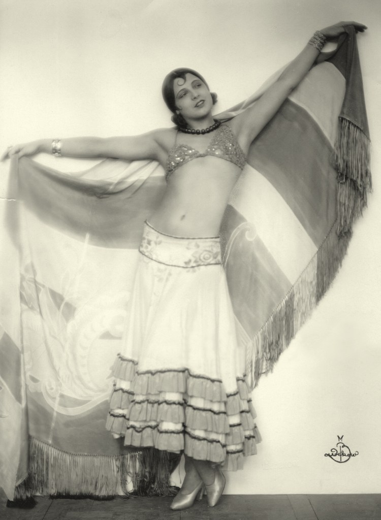 Atelier M. Badekow :: Schauspielerin und Tänzerin Henriette Margarethe Hiebel [La Jana] in einem spanisch-folkloristischen Rock mit weitem Umhang, undatiert, ca. 1928. Actress and dancer Henriette Margarethe Hiebel [La Jana] in a Spanish folk skirt with a wide cape, undated, ca. 1928. | src and hi-res Getty Images
