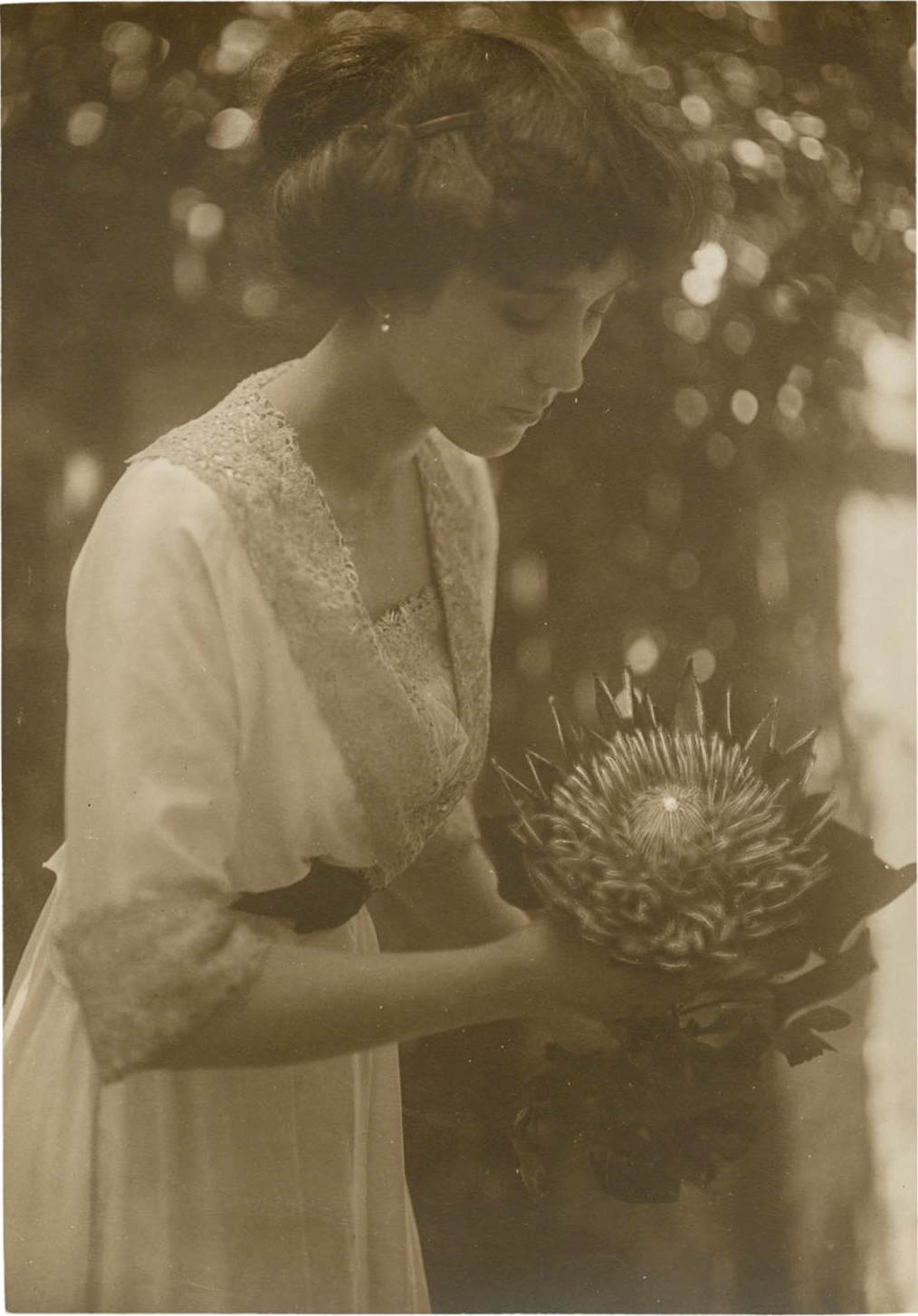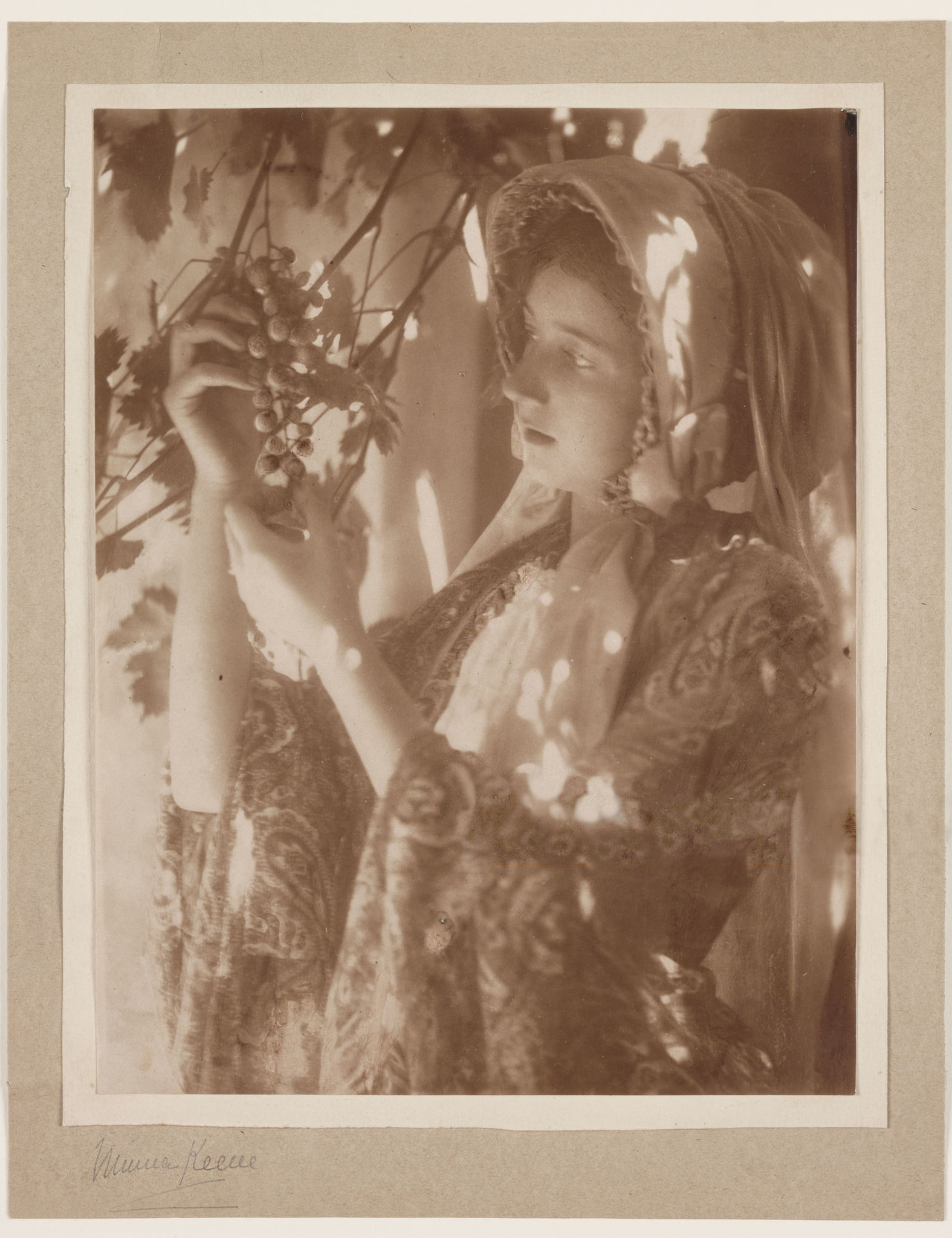 A fine example of a signed exhibition-quality image of one of Minna Keene’s most famous of images, taken at her home in Cape Town. Using her young daughter Violet as the model, she created an iconic Pre-Raphaelite image, combining the beauty of a young girl with nature. This image was included in the famous Tate London Exhibition in 2016, Painting with Light alongside Julia Margaret Cameron, Millais, Emerson, Goodall, Hacker, Rossetti, and others. In 1911, “Pomegranates” was awarded Picture of the Year at the London Photographic Salon. [quoted from source]