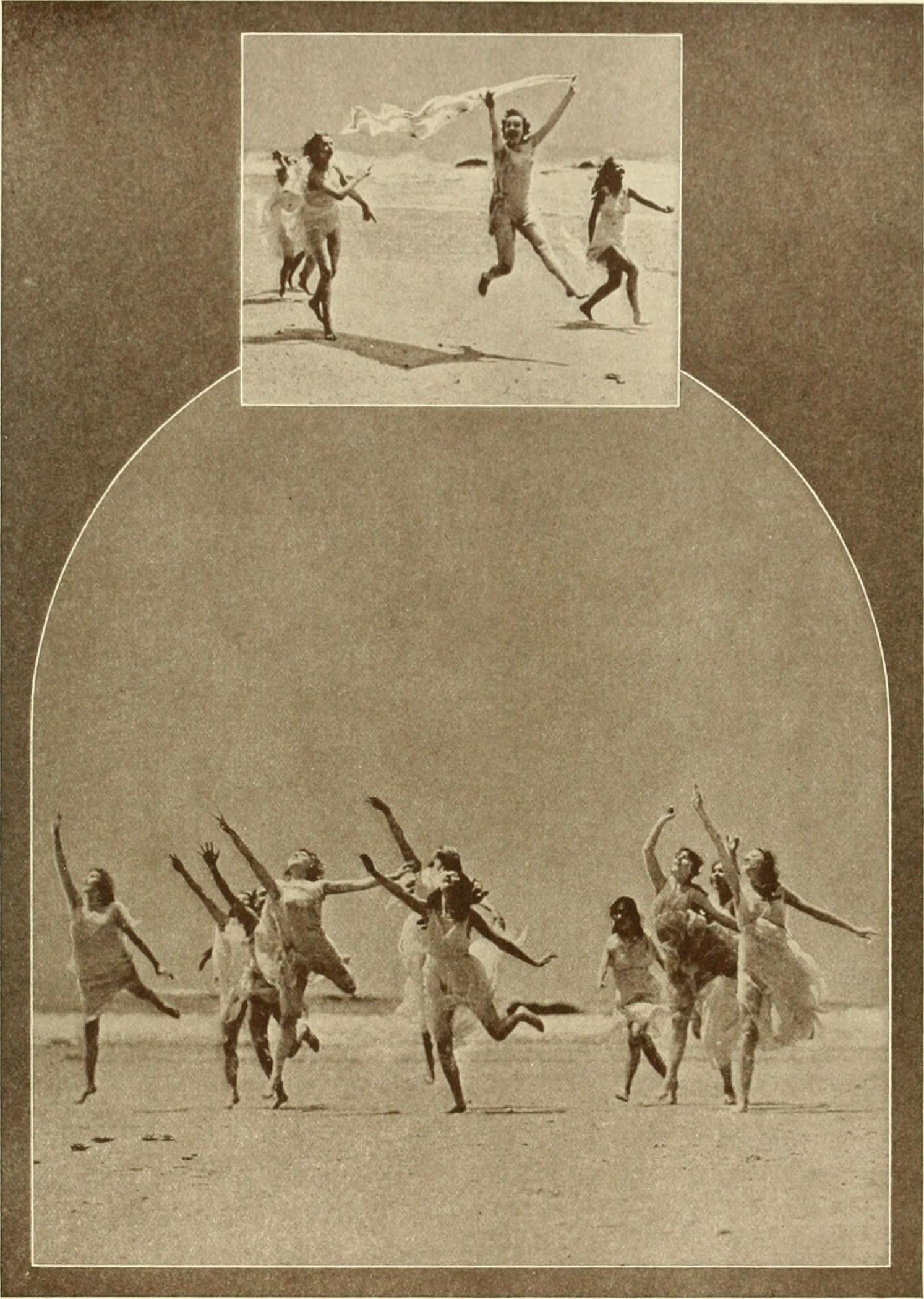 “The race, adapted from the classic Greek games, is useful in dance interpretations combining grace and swiftness of movement. The silhouettes compare fantastic with natural grace of movement.” From ‘Dancing with Helen Moller’, 1918. Page 106. University of California Libraries. | src internet archive“Drigo’s Serenade — showing how modem music of this character inspires the creation of dance movements and figures adapted from the purest Greek models. The beginning of the interpretation is shown in the small plate.” From ‘Dancing with Helen Moller’, 1918. Page 74. University of California Libraries. | src internet archive“A playful Spring movement — flowers and ribbons, and lightness of movement which seems almost to defy the force of gravitation. The small Tanagra figures suggest the same spirit.” From ‘Dancing with Helen Moller’, 1918. Page 42. University of California Libraries. | src internet archive“Here the dancer, erect and recumbent, realizes in living movement the classic sculptor’s sense of the aesthetic value of simple draperies.” From ‘Dancing with Helen Moller’, 1918. Page 48. University of California Libraries. | src internet archive“The ocean beach, upon which the surf rolls rhythmically, or is broken upon half submerged rocks, incites to the most open free and vital dancing expression.” From ‘Dancing with Helen Moller’, 1918. Page 86. University of California Libraries. | src internet archive“Reacting to the breath of Spring — the most compelling of all impulses to dance, and provocative of the most joyous physical expression.” Helen Möller and Curtis Dunham :: From ‘Dancing with Helen Moller; her own statement of her philosophy and practice and teaching formed upon the classic Greek model, and adapted to meet the aesthetic and hygienic needs of to-day’, 1918. Page 88. University of California Libraries. | src internet archive