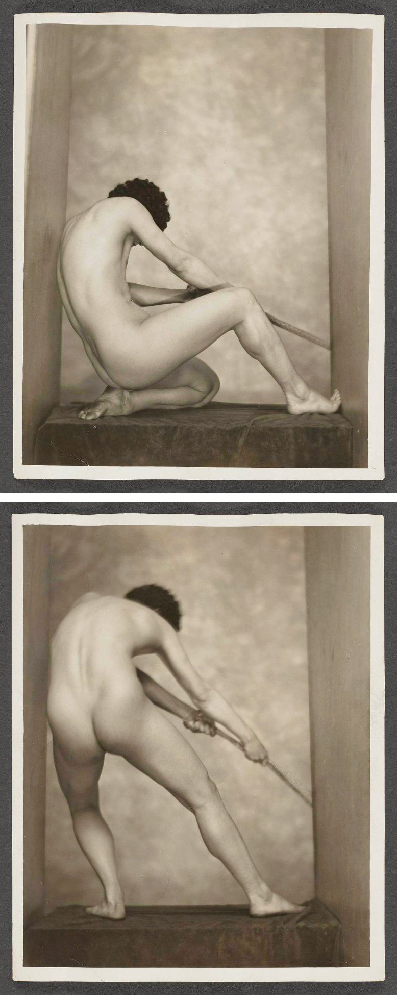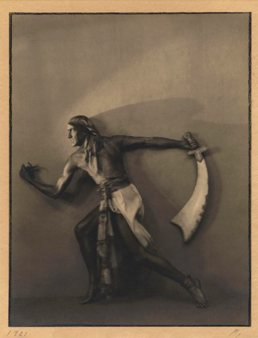 Nickolas Muray :: The Brigand, ca. 1921. Bromide print of a man [Hubert Julian Stowitts] in profile, creeping along a wall. He has a turban on his head and a sheath in his hand, he is poised on his toes. Verso: “Title: The Brigand by Nickolas Muray. 124 Macdougal Street New York.” and “London Salon, 1921.” | src NMAH ~Smithosonian Institution
