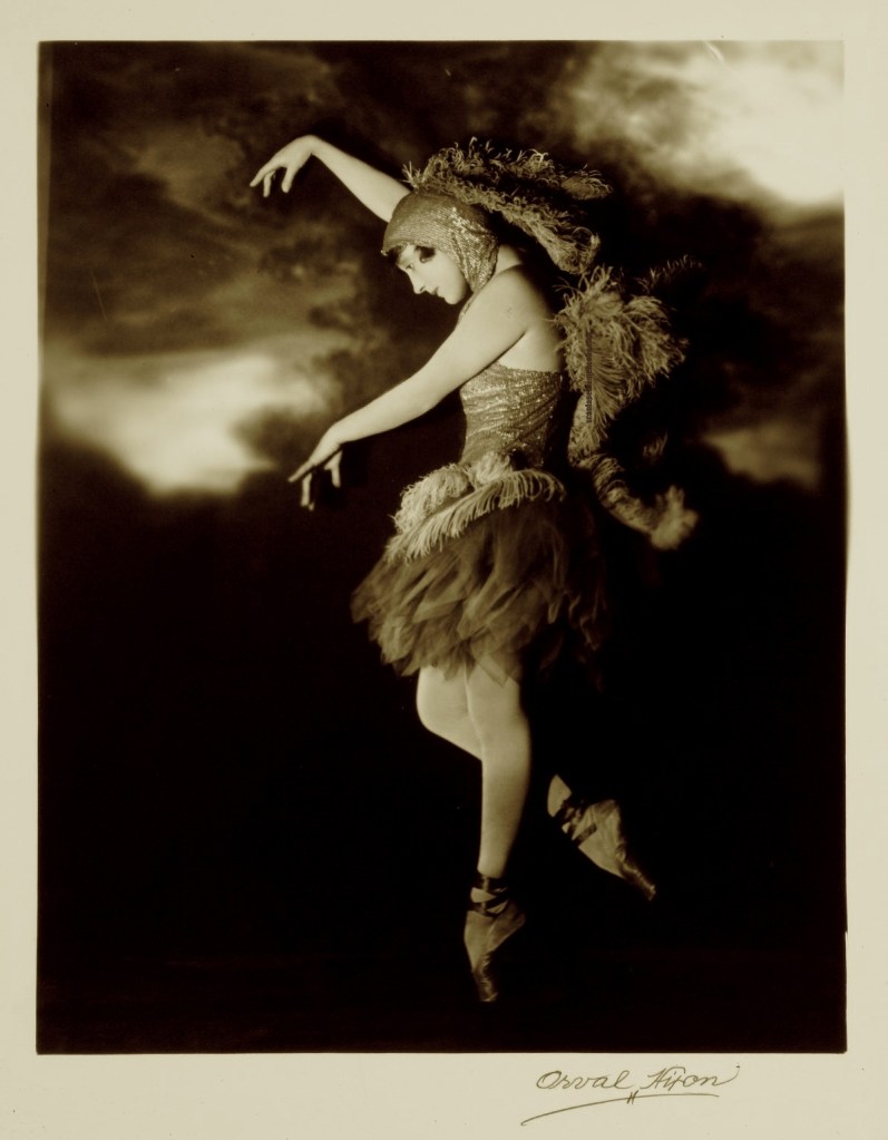 Orval Hixon :: Portrait of Autralian swimmer and actress Annette Kellerman, circa 1920. Profile of female dancing. She is wearing ballerina slippers and a feathery costume. Her arms are posed in front of her. | src Spencer Museum of Art – The Kansas University