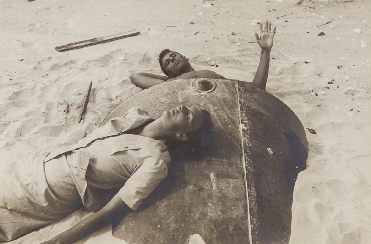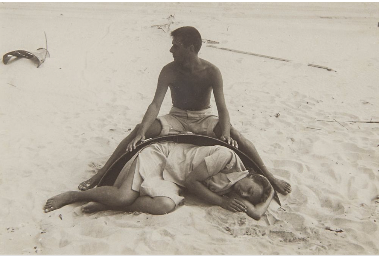 Pa Ja Ma Group :: Paul Cadmus (1904-1999), Jared French (1905-1987), and Margaret Hoening French (1889-1973). Photograph titled “Paul Cadmus and Margaret French, Saltaire, Fire Island,” 1938, depicting Cadmus and Margaret French laying in the sand. Photographed by Jared French. Silver gelatin print. | src Revere Auctions at Bidsquare