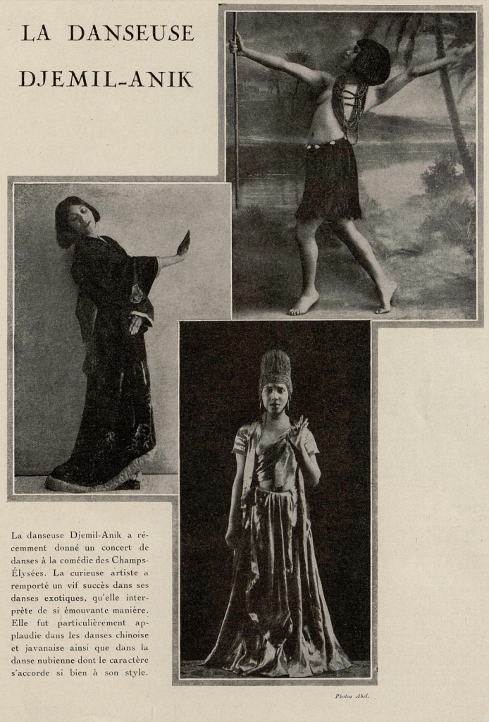 «La danseuse bosnienne Moa Mandu vient de donner un concert de danses à la Comédie des Champs-Elysées. La qualité savamment barbare de sa danse et l’originalité de ses costumes drapés avec art ont beaucoup plû.» | «The Bosnian dancer Moa Mandu has just given a dance concert at the Comédie des Champs-Elysées. The skilfully barbaric quality of her dance and the originality of her artfully draped costumes were very popular.» Published in La Danse, November 1922. | src CND ~ Médiathèque .