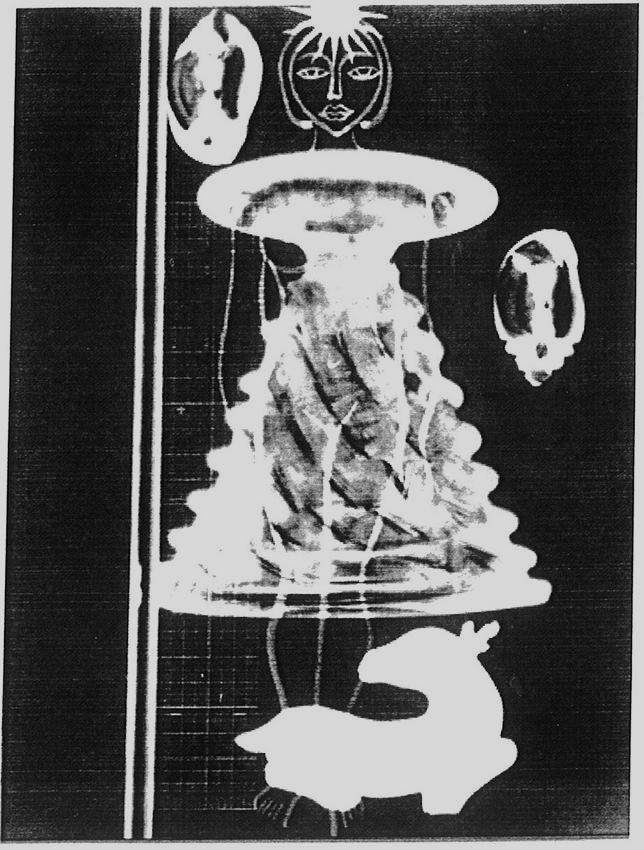 Nude figure of a young woman covered by an inverted glass, which becomes her garment. The translucent glass allows the curves of her figure to be seen, but it still provides a modest covering. The shape of the glass is reminiscent of dress styles of the mid-1800s, with a wide hooped skirt and narrow waistline. Rosa Rolanda painted self-portraits from 1945 and 1952 depict the same somber persona. The simple style of her features is similar to those found on folkloric images of the sun reproduced in ceramics, wood, and textiles. Here, crowned by the sun, she is surrounded by shells, a deer, and a ruler.