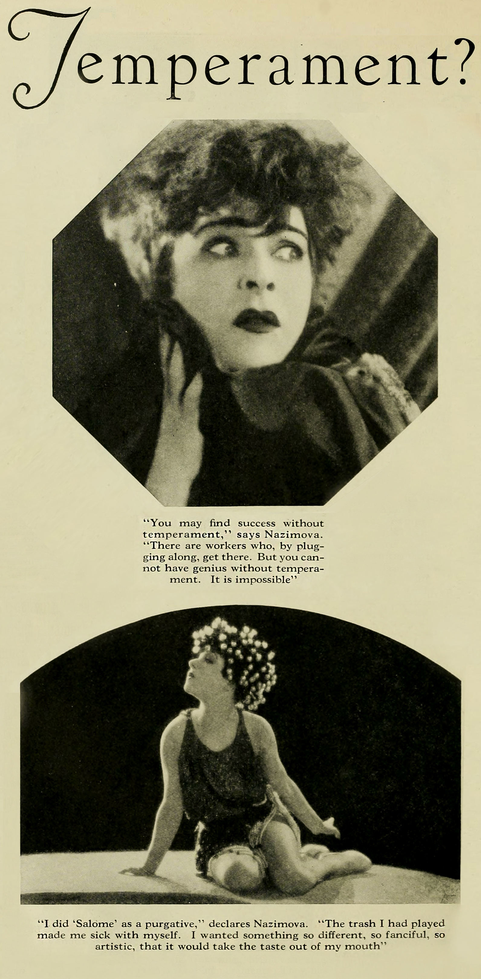 “I did ‘Salome’ as a purgative”, declares Nazimova. “The trash I had played made me sick with myself. I wanted something so different, so fanciful, so artistic, that it would take the taste out of my mouth”. Costume designs for Salome were Natacha Rambova’s (including the iconic wig).